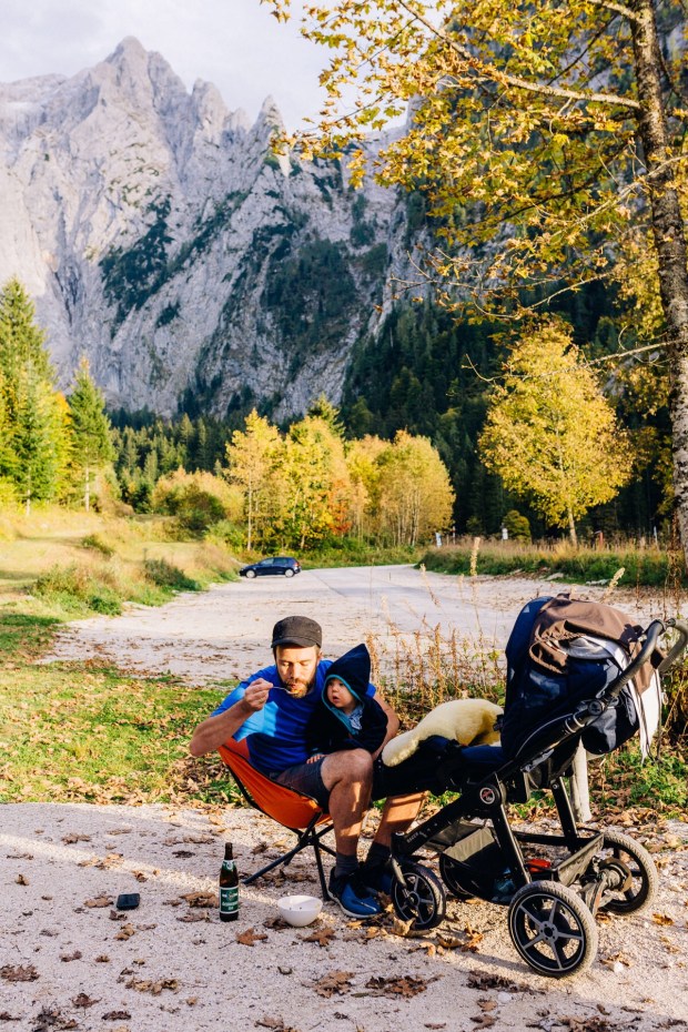 Wieder am Ufer angekommen gönnen wir uns zwei leckere Kugeln Eis und machen uns im Womo noch einen Kaffee, weil wir doch etwas müde sind. Kurz hatten wir überlegt einen Campingplatz anzusteuern, aber der Stellplatz vom Vorabend war einfach so schön und die Alm dort hat samstags geöffnet, wir wollen dort Abendessen. Also nichts wie hoch, Kinderwagen raus und los.