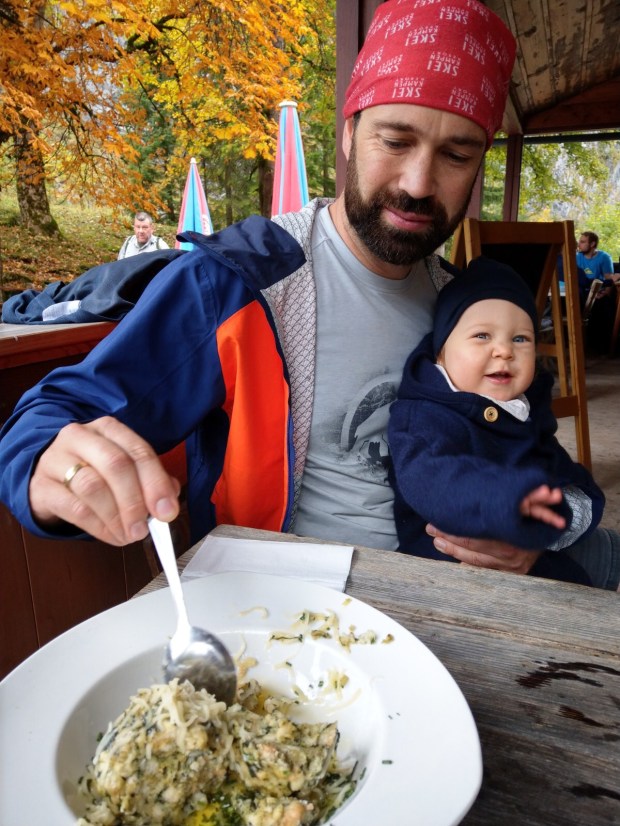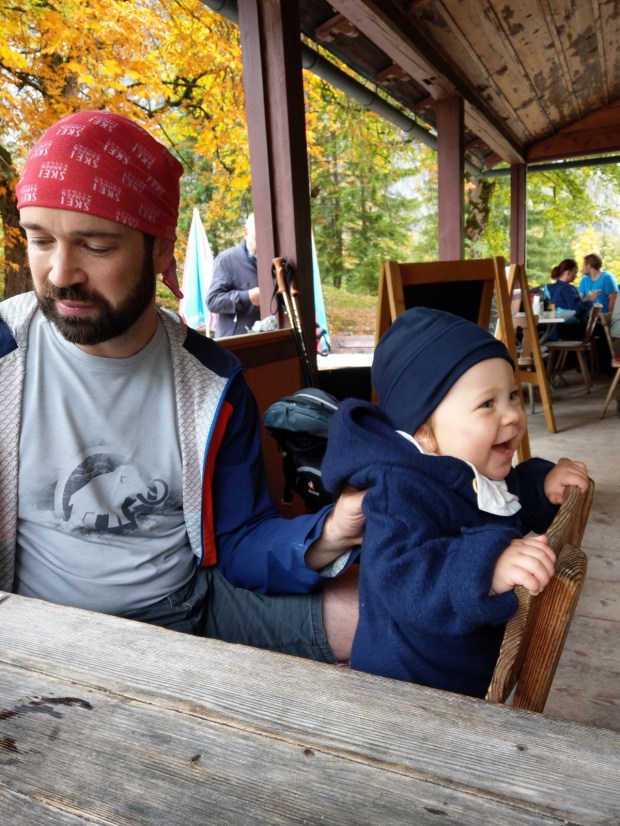 Das „Wimbachschloss“ hat zu unserer Freude geöffnet und auch die Küche hat schon ein breites Angebot an Speisen parat. Kurz überlegen wir, ob wir draußen oder doch lieber drinnen sitzen wollen, aber da es drinnen als wir ankommen noch nicht beheizt ist und der Boden zum Krabbeln auch nicht sauberer ist als draußen, bleiben wir an der frischen Luft. Johannes freut sich über seinen Aussichtsplatz und beobachtet Neuankömmlinge genau. Simon bestellt Spinatknödel und ich hab mal wieder Lust auf Germknödel, auch wenn die immer gleich schmecken. Simons Spinatknödel schwimmen in Butter und sind die besten, die er bisher gegessen hat! Für Johannes bestellen wir dann sogar noch eine Pfannkuchensuppe, damit er auch noch was warmes im Bauch hat.