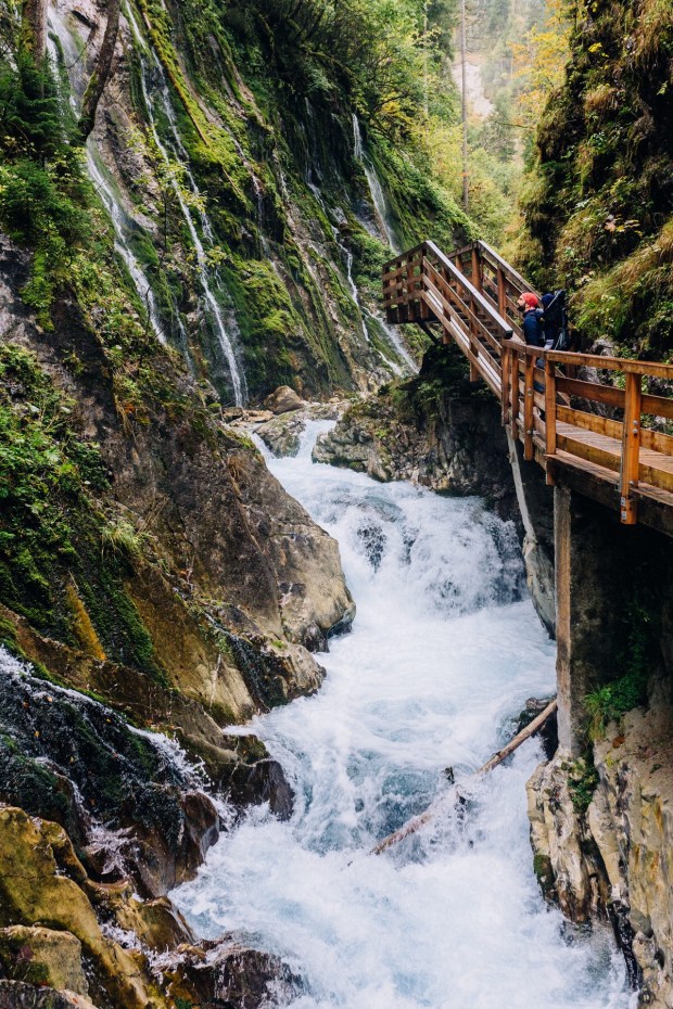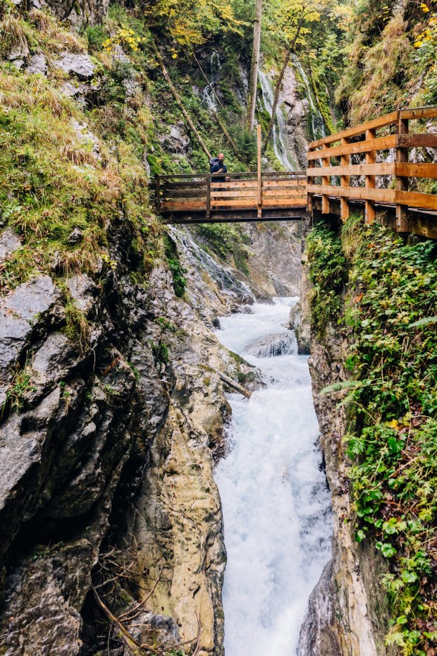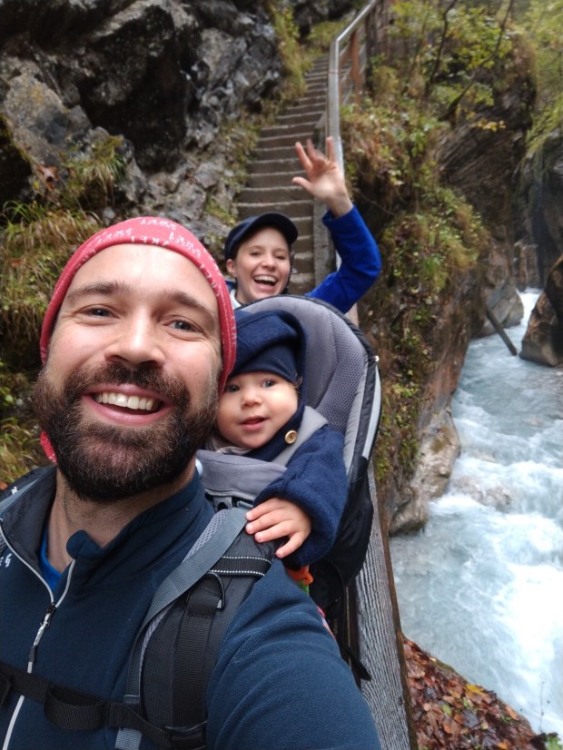 Die Klamm ist schnell erreicht, gerade so passt Simon mit der Kraxe auf dem Rücken durch das Drehkreuz. Lang ist die Klamm ja nicht, 250m glaube ich gelesen zu haben. Aber dennoch ist sie beeindruckend!