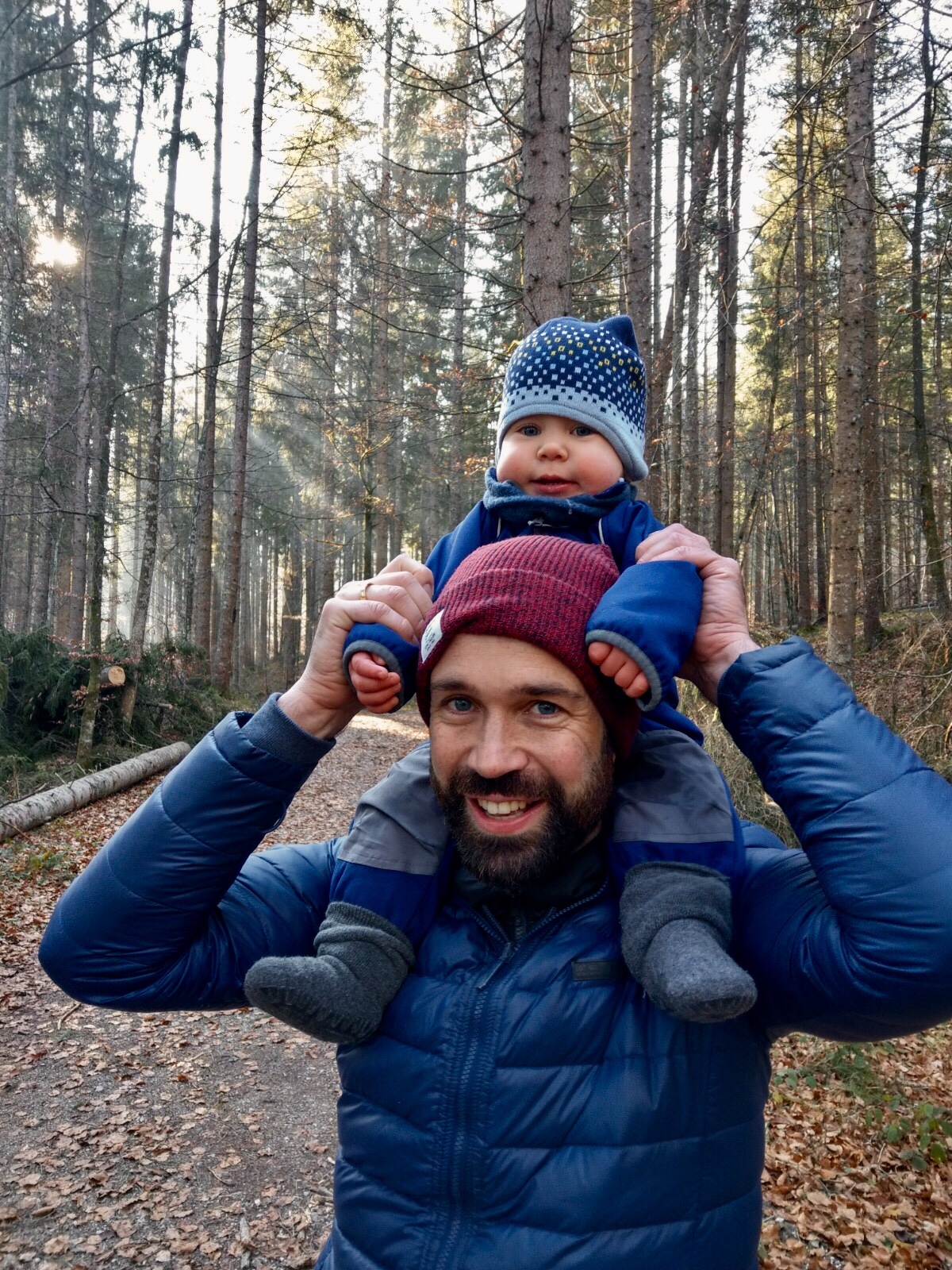 Auf den Kinderwagen hat er dann erst Mal keine Lust mehr, schließlich hat er ausgeschlafen. Also geht es Huckepack mit dem Papa!