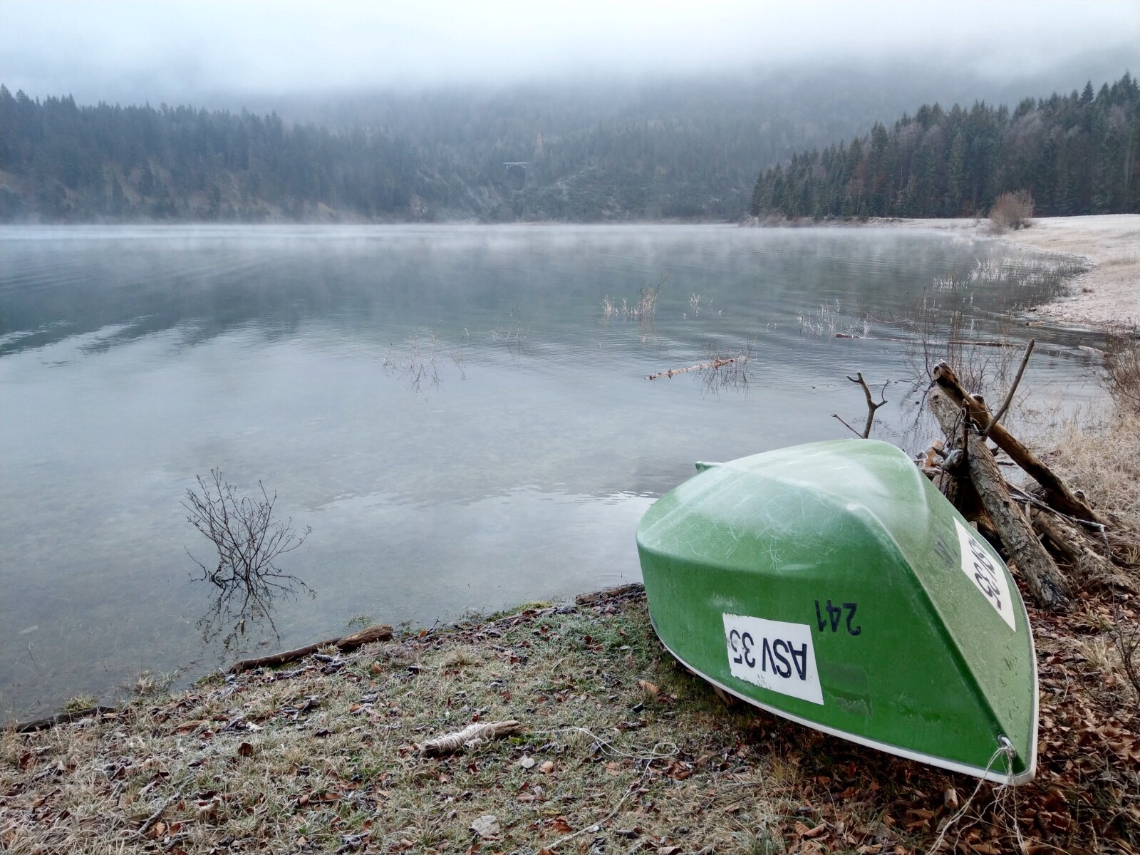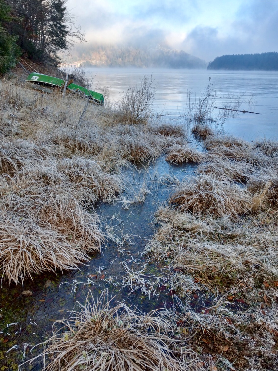 Dank Simons Handy-Karte fanden wir einen Abzweig, der uns an eine Wiese zum See führte und wir konnten unser Glück kaum fassen! Die Sonne war noch nicht hinterm Berg hervorgekommen und der Nebel hing in den Bäumen. Über dem See tanzten kleine Nebelschwaden und die Wiese war weiß gefroren mit Rauhreif! Wow!!!