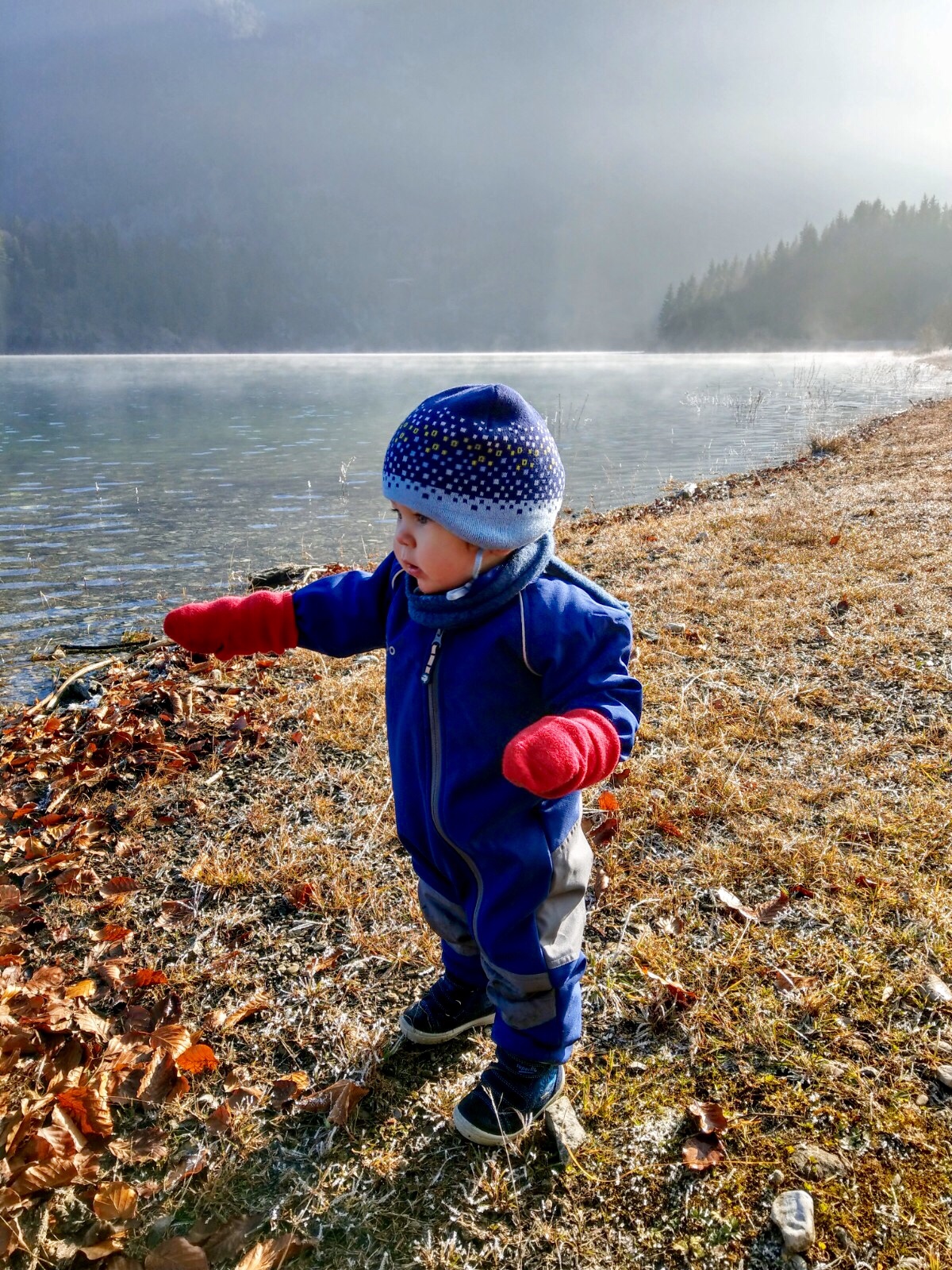 Als wir weiterwageln wollen, wird Johannes wach und will dann doch auch erst mal den See erkunden. Da ich seine Handschuhe vergessen habe, müssen die zu großen Stoppersocken herhalten. 😉