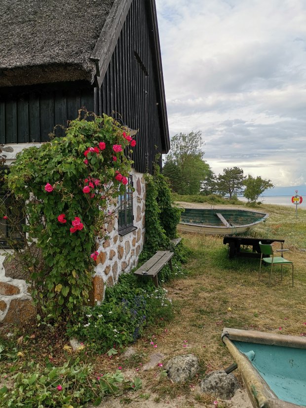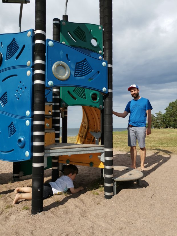 Am nächsten Morgen bin ich zur Erfrischung nach dem Frühstück erstmal in den See und hab danach geduscht, bevor wir wieder an die Küste und auf die Schäreninsel Hasslö gefahren sind. Wunderschön alles und deswegen auch viele Naturreservate. Wir steuern einen Parkplatz an, von dem aus man schnell an einen Strand mit ganz flachem Meerzugang kommt. Ideal für den Zwerg! Und Schaukeln gibt es auch noch.