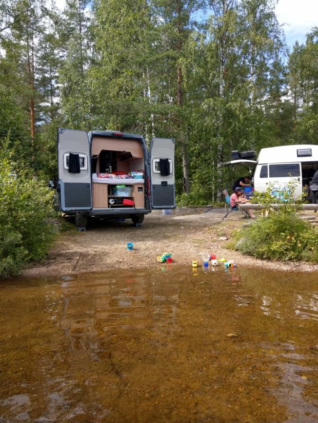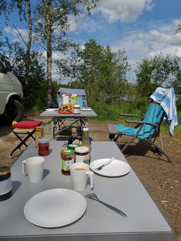 Offizielle Check-in Zeit ist erst um 15 Uhr, aber wenn der Platz schon frei ist, darf man reinfahren. Bei uns war es 13 Uhr und der Platz war echt top! Kein Strom, aber umgeben von Heidelbeeren und Blick auf den See. Die Wasserpumpe war auch gleich nebenan. Ich konnte Johannes erfolgreich hach hinten umbetten und wir hatten tatsächlich ein kleines Ruhepäuschen, um anzukommen.