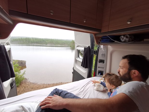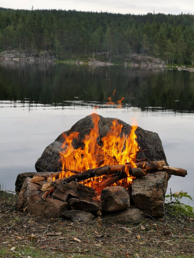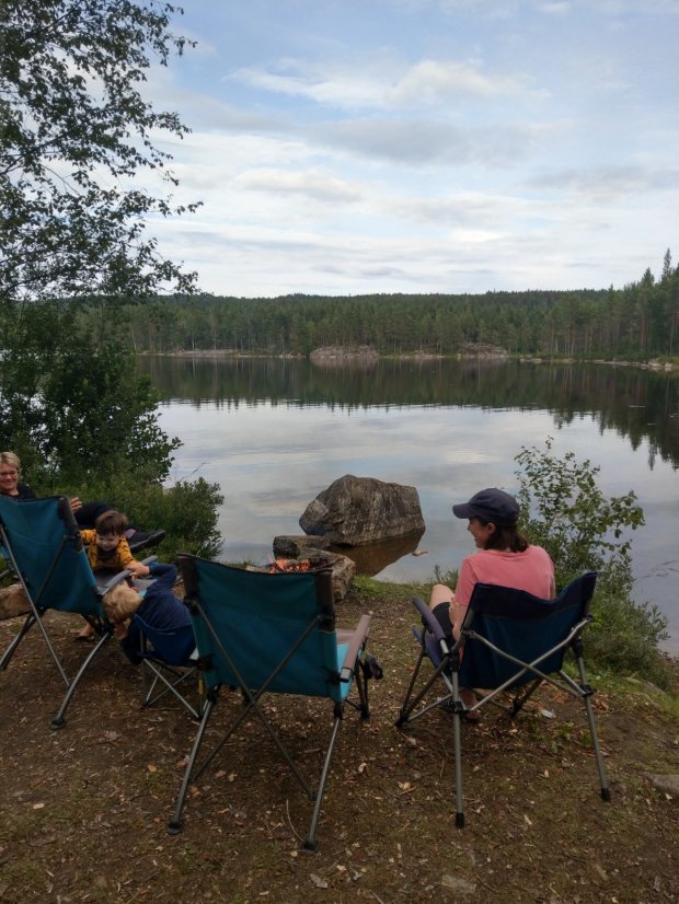 Abends gab es bei allen Nudeln und das gesammelte Holz reichte ziemlich lange für das Feuer. Auch, nachdem die Jungs schon im Bett waren saßen wir noch länger draußen. Mit Mücken ist es auch bisher gar nicht so wild, nur die Bremsen verderben mir tagsüber die Laune… Mistviecher… Über Nacht kommt dann der lang angekündigte Regen und der Morgen ist nass und ein bisschen kühler.