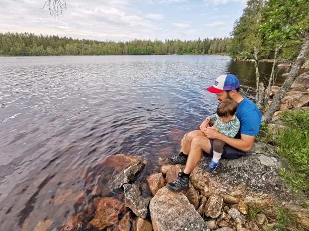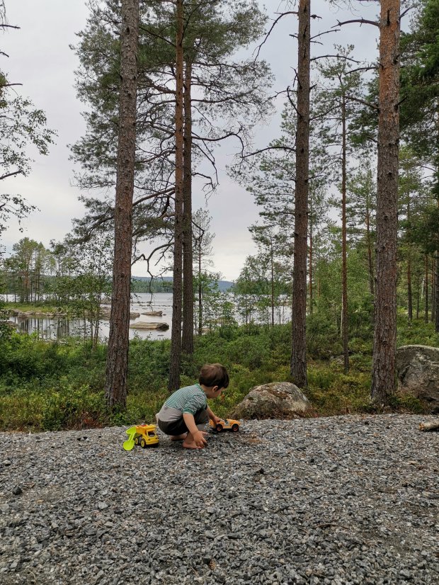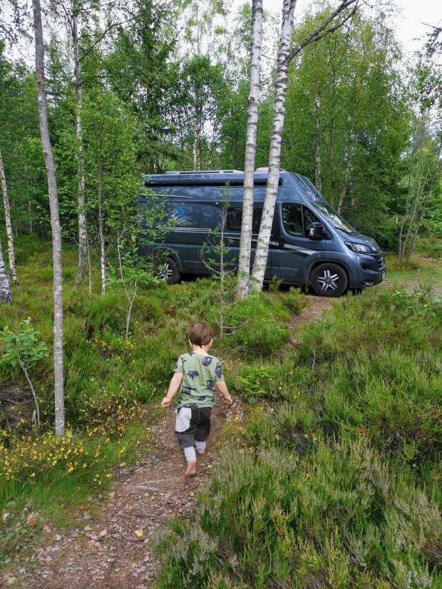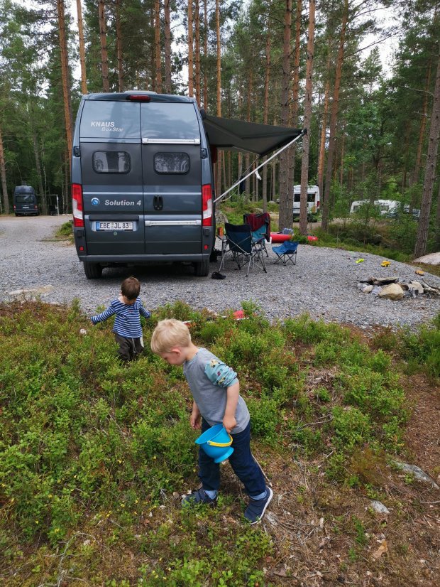 Am nächsten Morgen wollten wir eigentlich auch nochmal aufs Wasser, aber vor lauter Ratschen und Spielen kam es anders. Wir haben uns total gefreut, als unsere Nachbarn uns gefragt haben, ob wir Lust hätten, mit ihnen noch eine Nacht im Glaskogen frei zu stehen. Der Platz, an dem sie vorher gestanden hatten, wäre groß genug für zwei Womos und sah wirklich Hammer aus! Und das schlecht angekündigte Wetter war noch nirgendwo zu sehen. Auf geht’s!Also alles eingepackt, Boot nur einigermaßen zusammengelegt, da wir es nochmal nutzen wollten, Wasser wieder aufgefüllt und Klo ausgeleert und ausgecheckt. Mittlerweile hatten wir mitgekriegt, dass man sich für ca. 6€ p.P/Tag die Glaskogskortet erwerben kann, mit der man die Rastplätze, Wanderwege, Feuerstellen inkl. Feuerholz und Trockentoiletten benutzen kann. Ein Freisteh-Freifahrtsschein also irgendwie. Wunderbar.