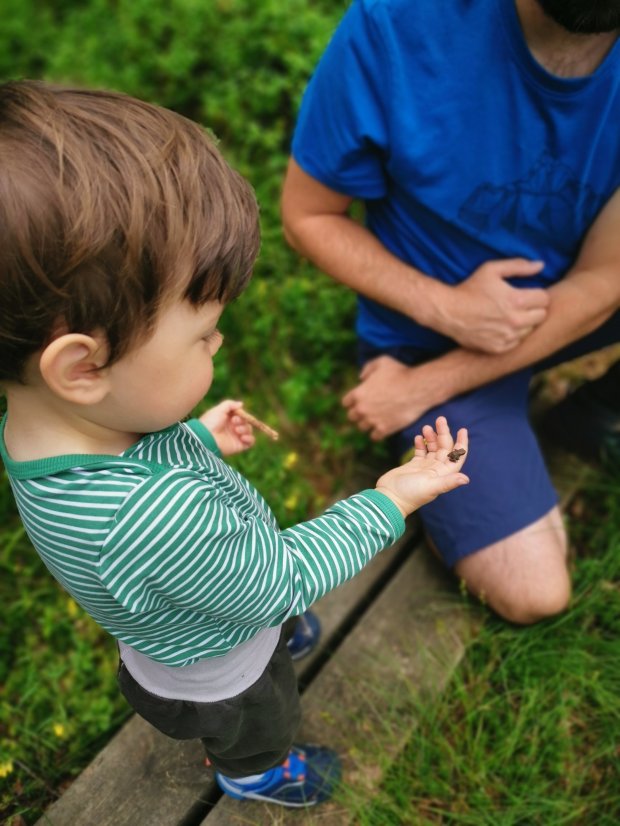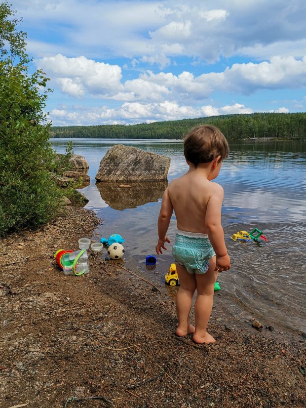 Nach dem Regenschauer fand Johannes die Spielzeugautos des Sohns unserer Platznachbarn interessanter und so kamen wir schnell ins Gespräch. Ich finde es immer total spannend zu hören, wohin andere Familien schon zusammen gereist sind und dieser höhergelegte, selbstausgebaute Allrad-T4 mit Dachaufbau war unter anderem schon zweimal auf Island unterwegs. Das wäre ja von uns auch ein Träumchen… Johannes war mit seinem neuen Freund auf jeden Fall total happy und gut beschäftigt. Fremde Spielsachen sind sowieso die besten.Dann durfte er aber mit Papa eine erste Runde im Kayak mitfahren. Das wäre allerdings fast gleich noch vor Beginn gescheitert, weil Johannes nicht darauf erpicht war, die Schwimmweste anzuziehen… Dann ging es aber doch zumindest einmal am Ufer entlang bis zum Womo und wieder zurück. Genug Zeit für Mama, sich zum Schwimmen fertig zu machen und sich ein wenig zu erfrischen.