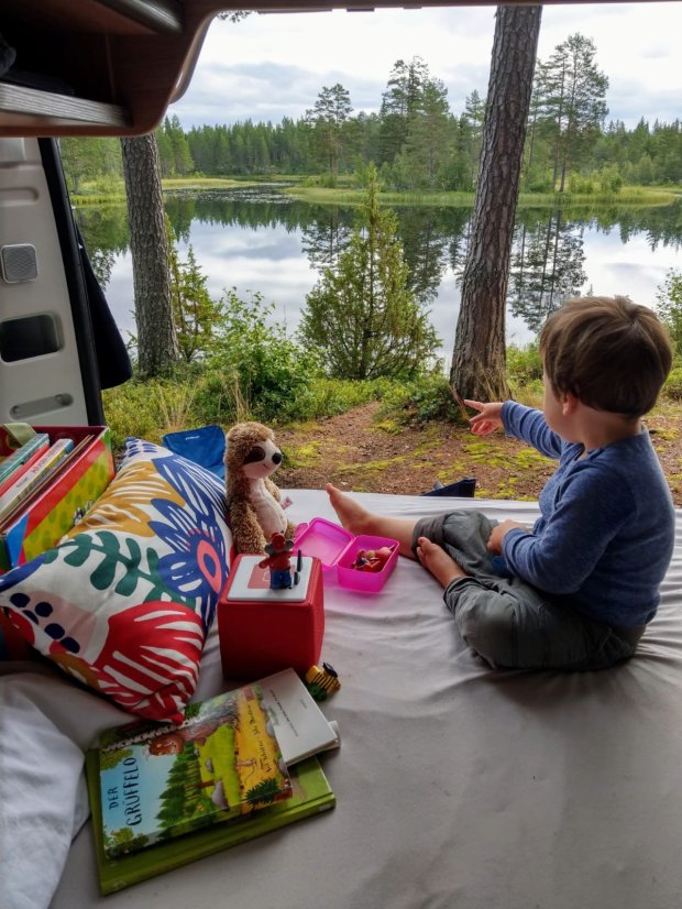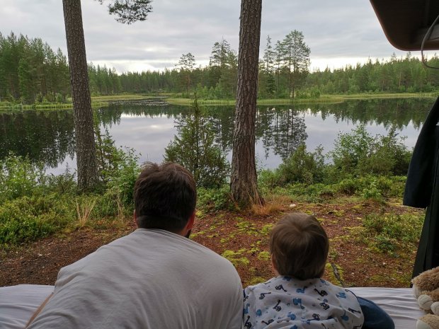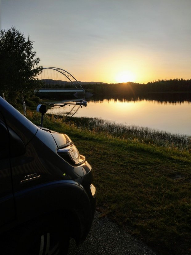 Irgendwie war Johannes gestern echt in guter Fahrtlaune. Nachdem wir erst ein paar Mal Pech hatten bei der Nachtplatz Suche und dann immer weiter fuhren, als Johannes schon im Schlafanzug war, gelangten wir sogar bis Sorsele, also 480 Kilometer nördlich vom Vorabend. Wir parkten auf dem Parkplatz vor einer Kirche mit Blick auf den Fluss bei Sonnenuntergang, der gestern um 22:40 Uhr war. Johannes ließ sich problemlos nach hinten umbetten und schlief gleich weiter.