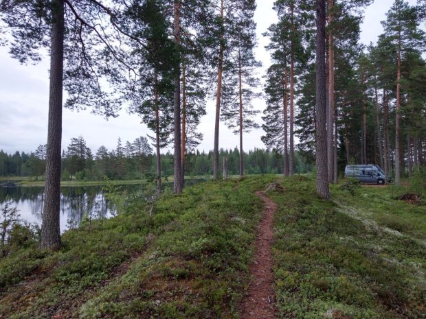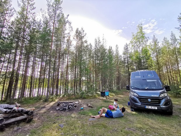 Da es aber schon knapp 16Uhr war, sind wir nicht mehr bis ganz rein zum Wandern gefahren, sondern haben kurzerhand an einem schönen Platz im Wald am See Halt gemacht, der unterhalb des Vattenfall Kraftwerks liegt. Bald gesellte sich noch ein Viano dazu und später ein Skoda mit Dachzelt.