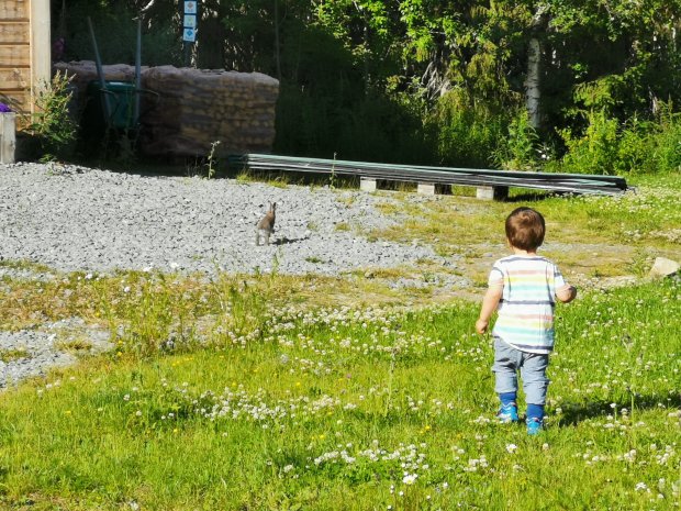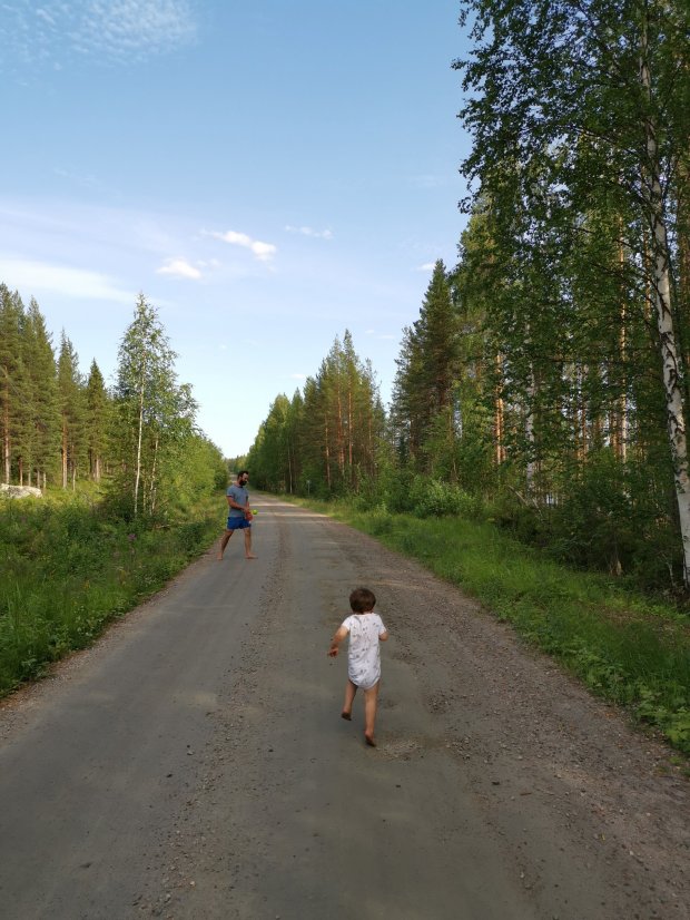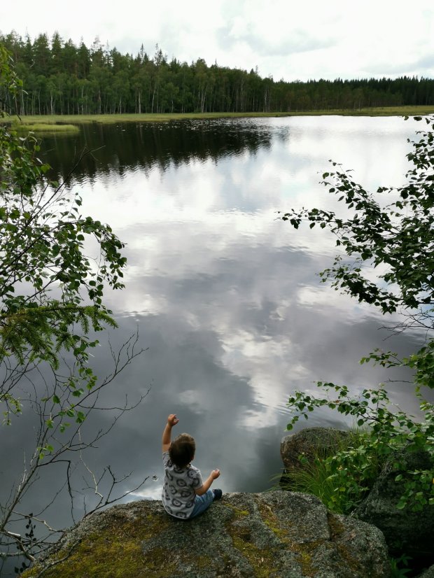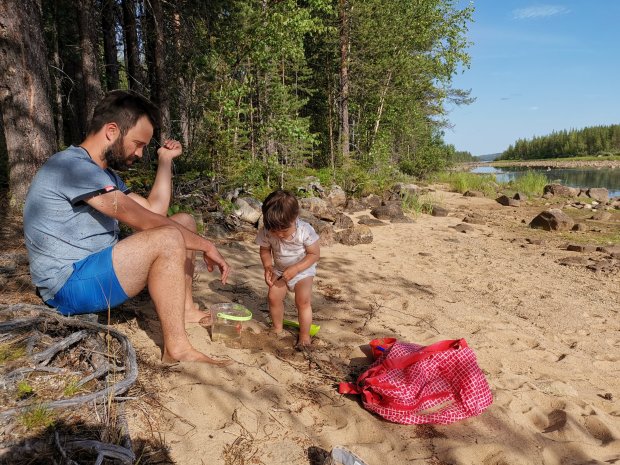 An einer Kreuzung entschloss Simon sich dann kurzerhand dazu, einen Anhalter mit riesigem Rucksack mitzunehmen. Er hieß Frederico, war Italiener und 40 Jahre alt. Ein Lebenskünstler, der schon zwei Monate in Schweden mit Rucksack unterwegs ist und gerade Richtung Abisko und Kungsleden wollte mit einem 28kg Rucksack und Vorräten für zwei Wochen. Da das Einsteigen und Begrüßen für Johannes Mittagsschlaf zu laut war, wurde er schlecht gelaunt wach und wir mussten um 12 eine Pause an einem See machen, wo ich schnell für alle Nudeln gemacht habe und Johannes etwas planschen konnte.