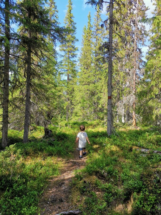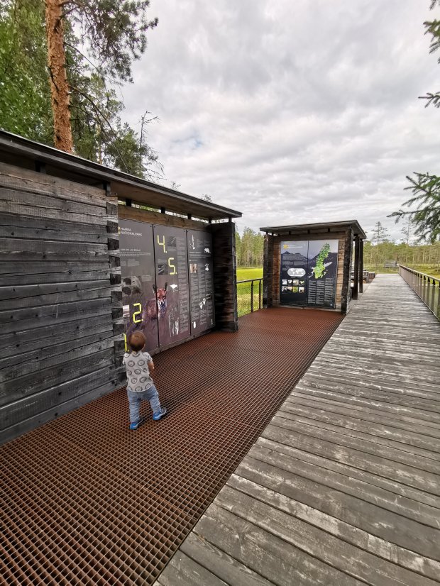 Dann sind wir aber weiter in Richtung Hamra Nationalpark gefahren, den kleinsten Nationalpark Schwedens. Dort sind wir eine kurze Runde durch Moore und alte, wunderschöne Wälder gewandert und Johannes konnte über die Stege und Bretterwege viel selber laufen.