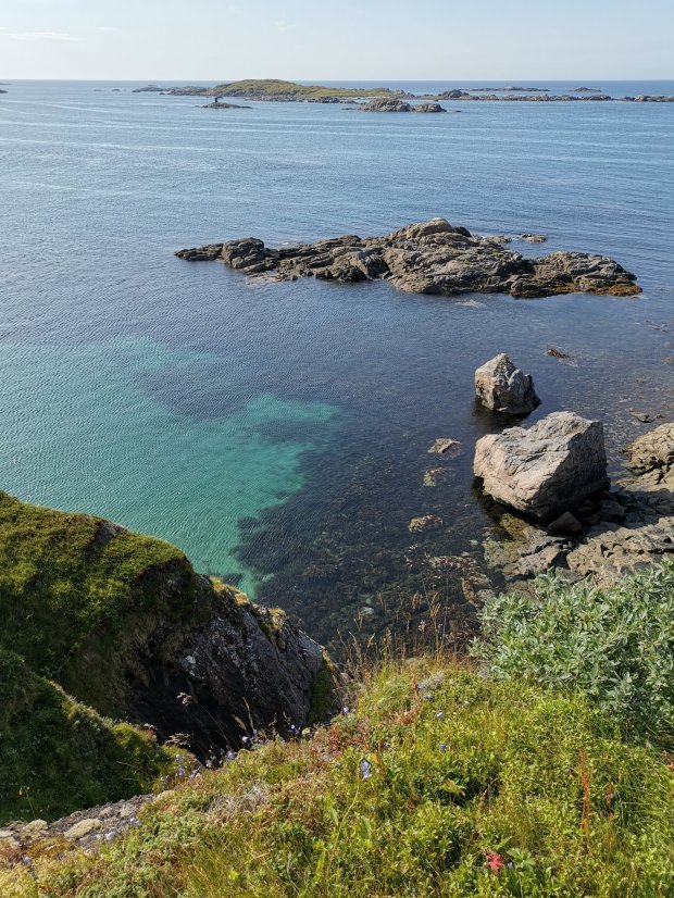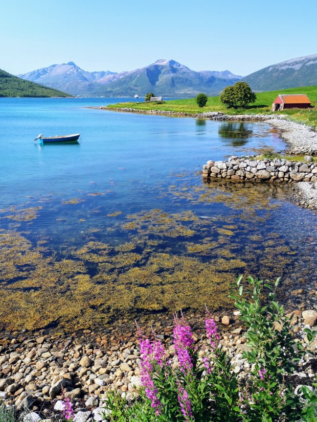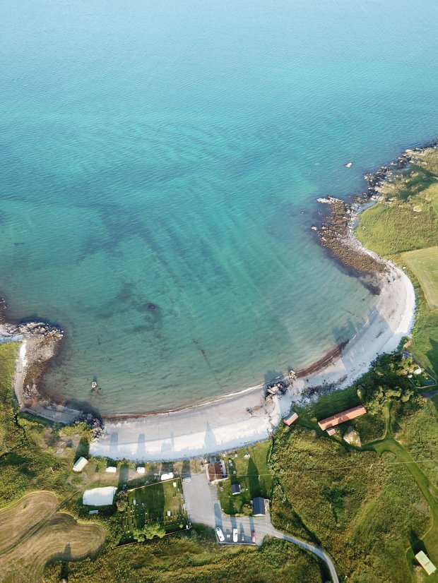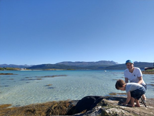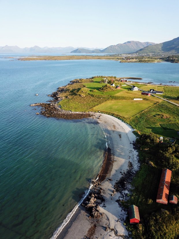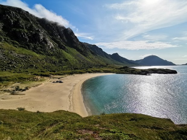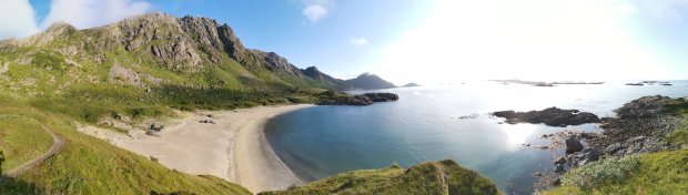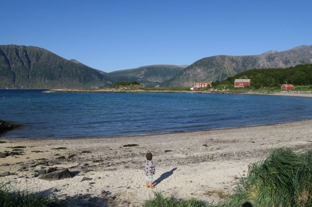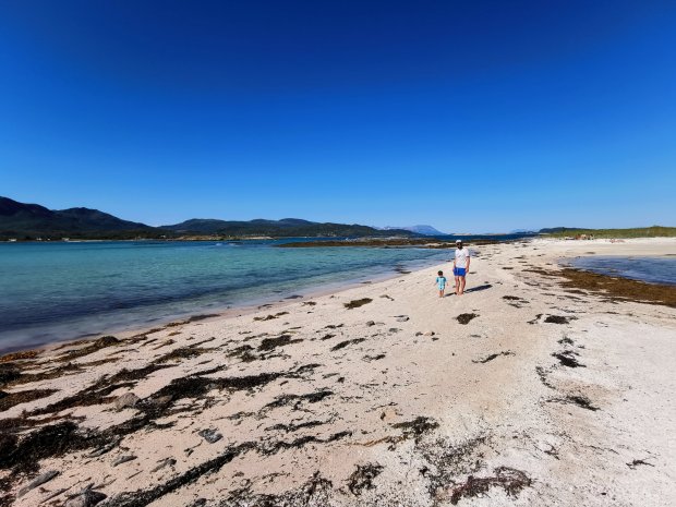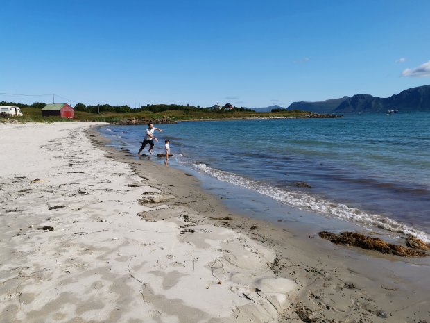 Über eine hohe Brücke fahren wir dann schließlich auf die Vesterålen, eine Inselgruppe nördlich der wesentlich bekannteren Lofoten, die wir im Anschluss noch besuchen wollen. Schon von der Brücke aus erkennt man das karibisch-blaue Wasser!