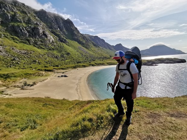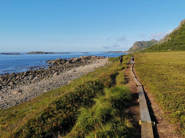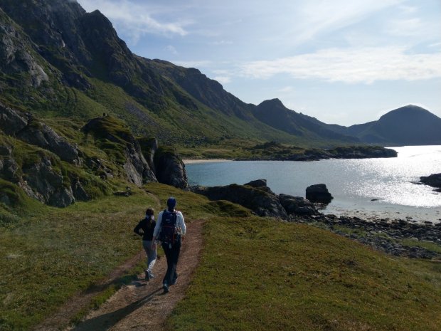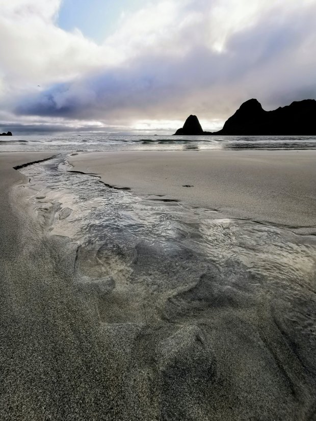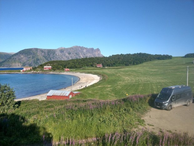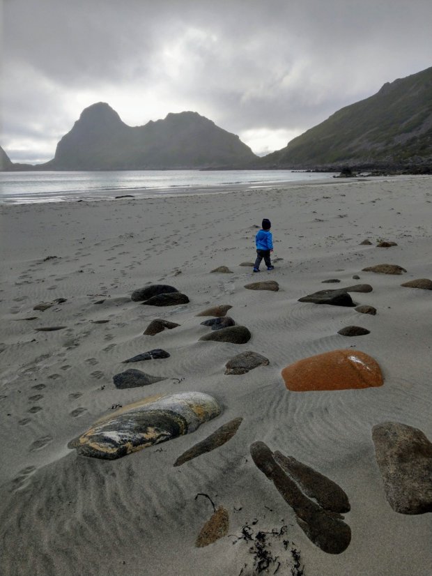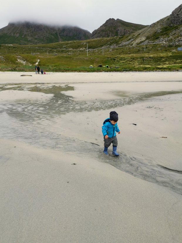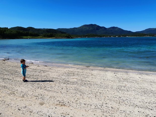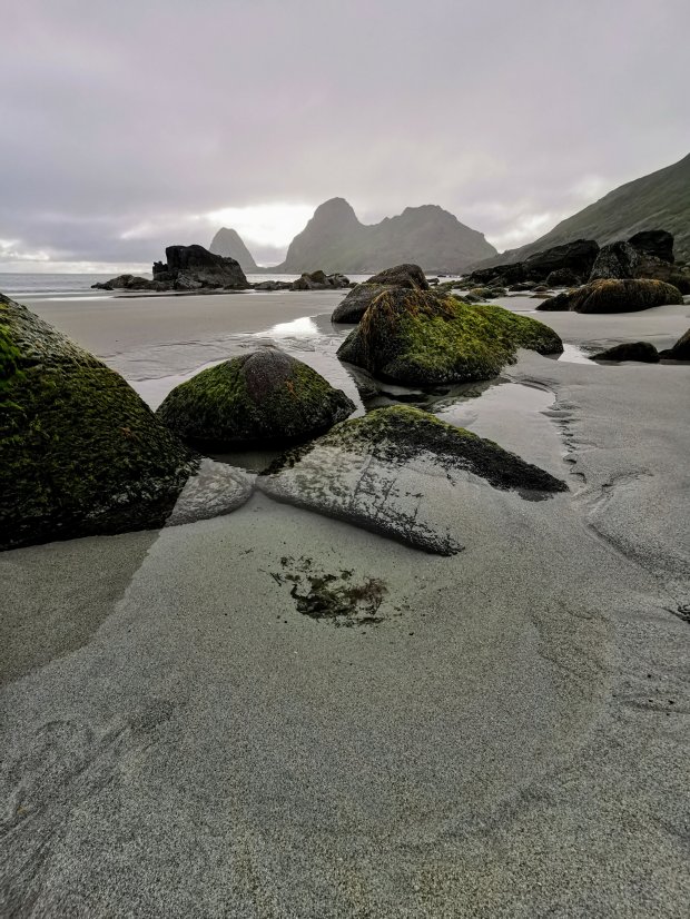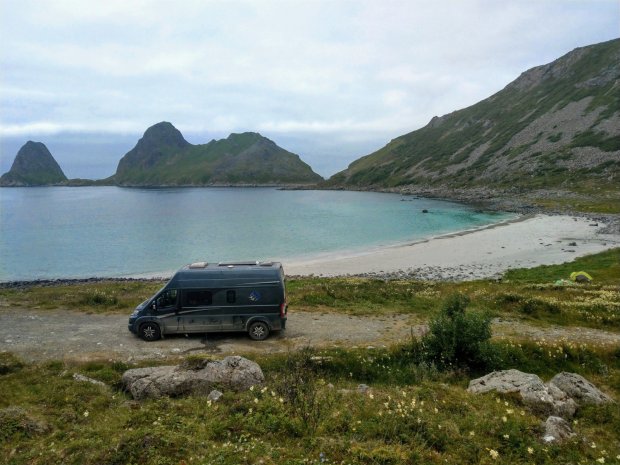 Wir fahren schon eher los und müssen ver- und entsorgen und dringend Milch und ein paar andere Lebensmittel kaufen. Wir steuern grob Hovden an und finden bei Nykvag einen tollen Platz, wo gerade vor uns ein VW Bus rausgefahren ist. Wir stellen uns so hin, dass wir quasi einen Platz freihalten und prompt kommt der VW Bus wieder, stellt sich aber woanders hin, weil die Insassen unten ihr Zeltlager aufgeschlagen haben. Das Wetter ist nicht ideal, aber wir bleiben trotzdem. Der Strand ist zu schön und es gibt gleich eine kleine Wanderung nebenan.