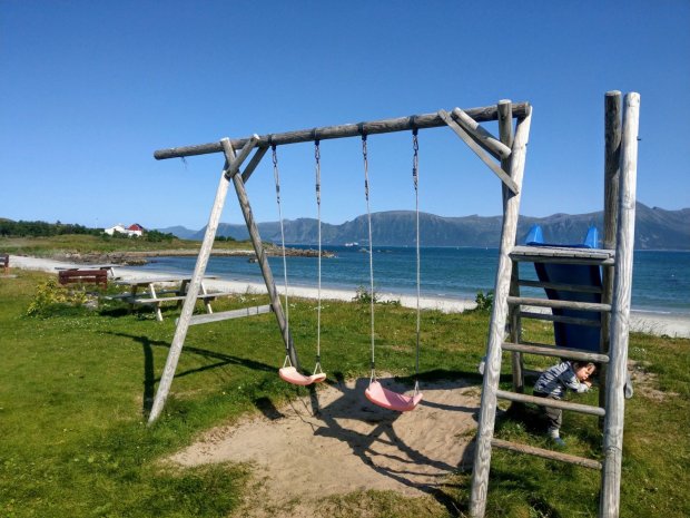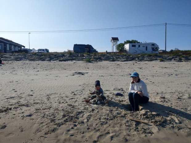 Der Platz liegt an einem perfekten Sandstrand neben einem kleinen Friedhof und einem für alle frei zugänglichem Gemeindehäuschen mit Küche und Klo mit Dusche. Daneben ist auch noch ein Spielplatz und eine große Kiste mit Sandspielzeug. Perfekt!!!