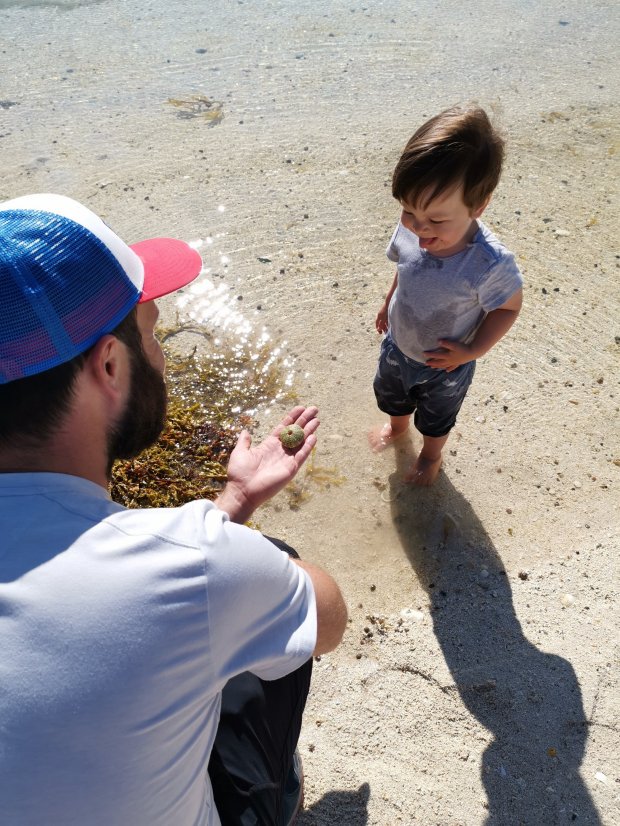 Wir gehen vor zum gut besuchten Strand, spielen im Sand und erkunden die Buchten.