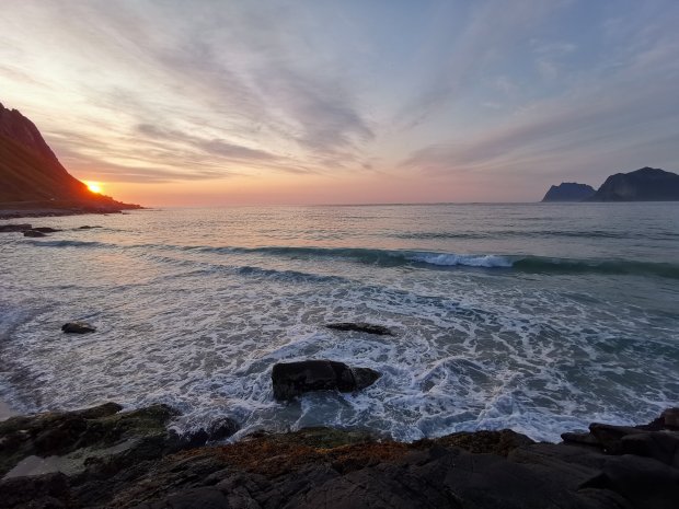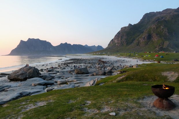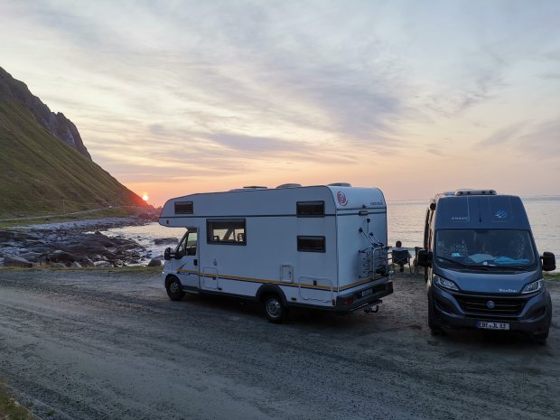 Wir haben dann zusammen ein Lagerfeuer inklusive Grillen gemacht. Jonas hat sogar die Gitarre ausgepackt und richtig toll gespielt und gesungen. Einer unserer besten Abende auf den Lofoten!Und dann noch dieser Sonnenuntergang!An diesem Tag ging sie übrigens um 22:39 Uhr unter.