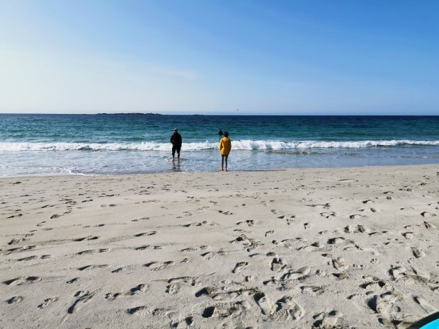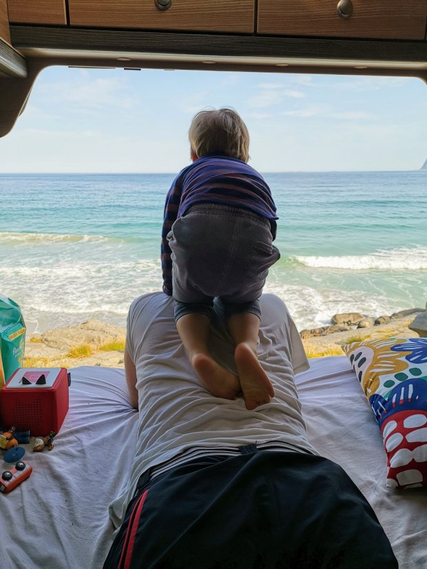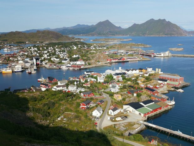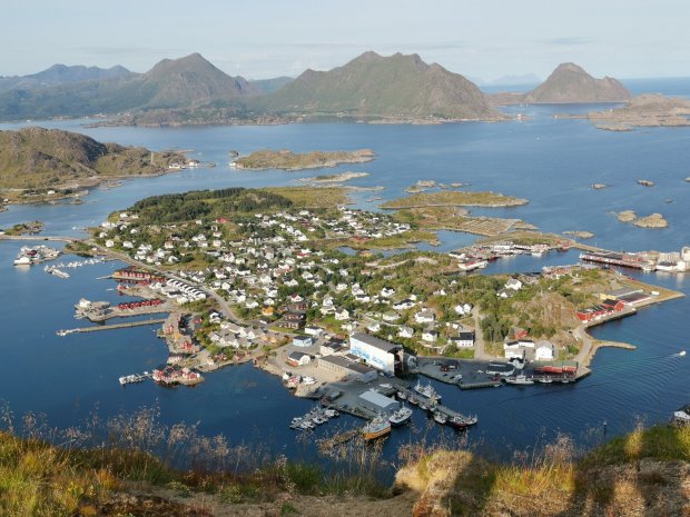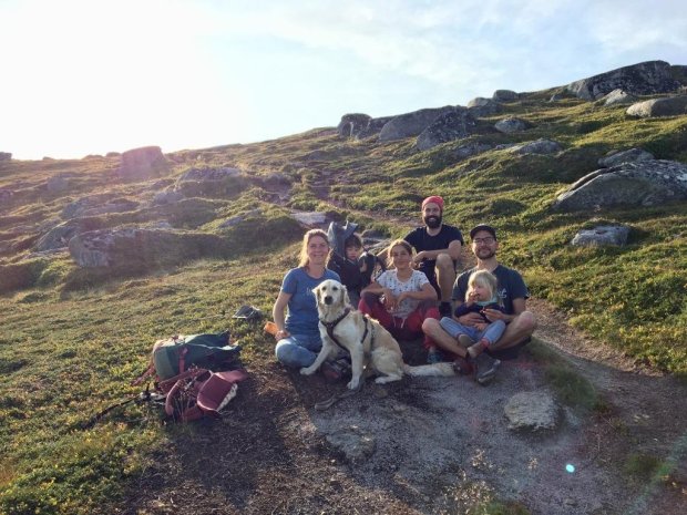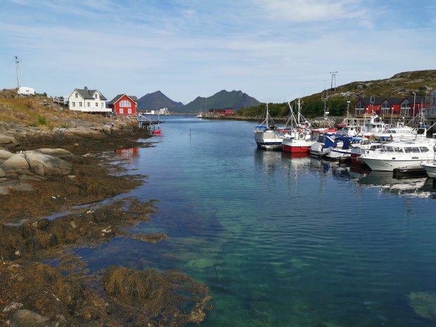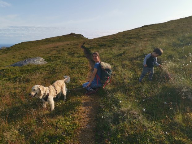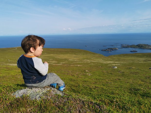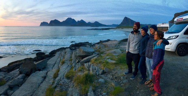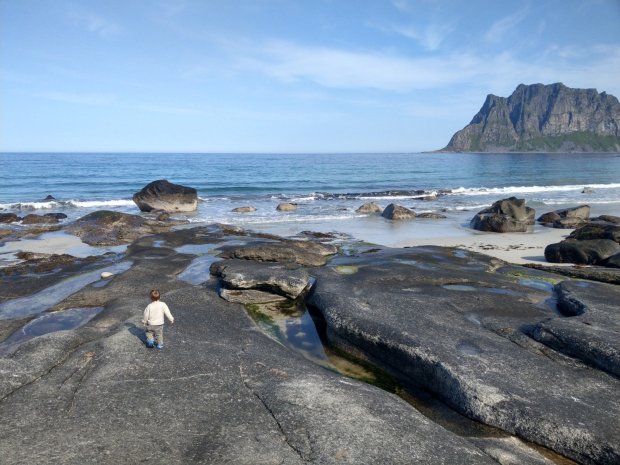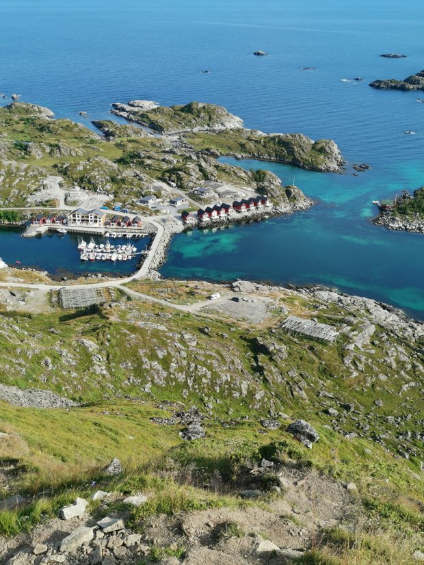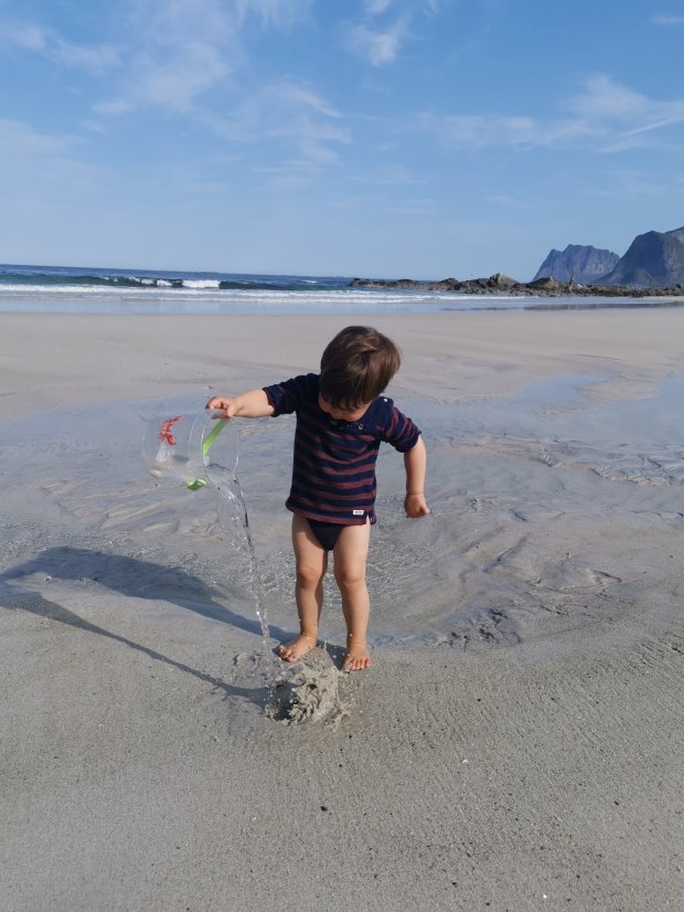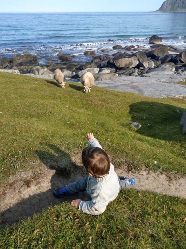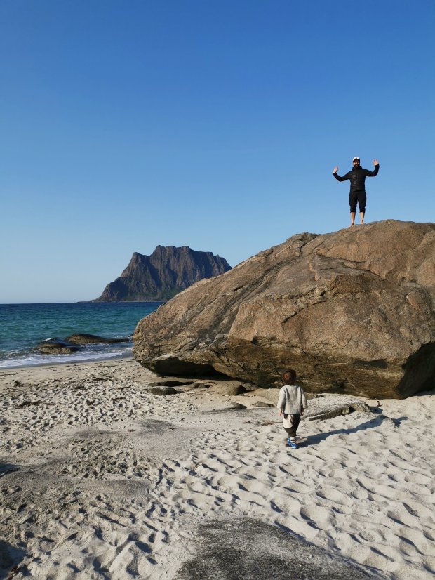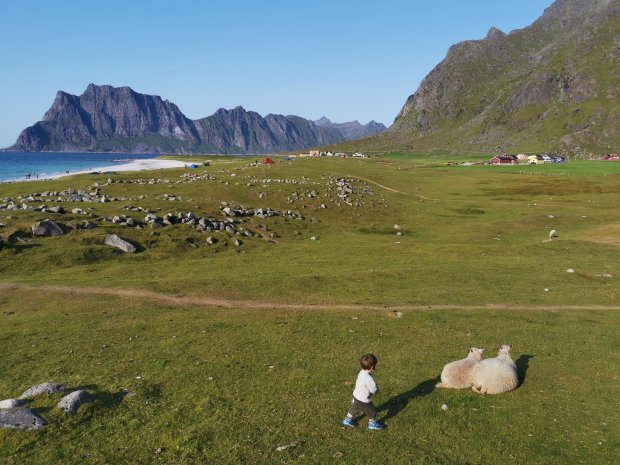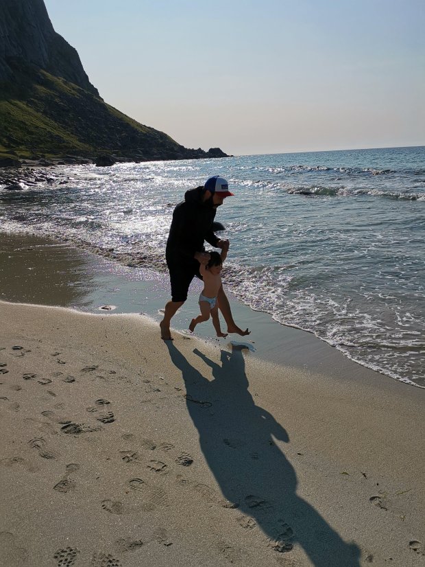Am nächsten Morgen haben wir es gemütlich angehen lassen und Simon war mit Johannes nochmal lange am Strand und bei den Schafen unterwegs.Danach fuhren wir gemeinsam mit den Coburgern weiter nach Ballstad, wo wir zunächst im Hafen eine Mittagspause einlegten und uns dann zu einer kleinen aber sehr steilen Wanderung entschieden. Da wo wir parken, werden gerade ganz neue und sehr schicke Rorbuer (die roten Häuslein) und Apartments gebaut. So neu, dass auf Google Maps noch nichts davon zu sehen ist.Der Aufstieg ist dann wirklich extrem steil und wegen des vielen losen Gerölls auch sehr rutschig. Ich leihe Jonas meine Stöcke, weil er Maja hochträgt und sie da gut gebrauchen kann. Man hat aber schnell eine tolle Aussicht.Johannes ist mal wieder nicht in guter Kraxen Laune und sobald wir eine sichere ebene Stelle auf dem Hochplateau erreicht haben, darf er raus und ein bisschen rumlaufen. Die Männer und die Mädels gehen noch einen Aussichtspunkt höher, Lisa und Cookie bleiben bei uns.Wieder vereint, machen wir dann noch eine Kuchenpause, weil Jonas Geburtstag hat.Johannes ist wieder in der Kraxe und die Ausblicke von der Klippe sind nicht übel. Wer entdeckt Lisa und Cookie auf dem nächsten Bild?Hier nochmal ein Blick auf Ballstad und das angeblich größte Wandgemälde der Welt (?) an der Werft. Als wir wieder unten sind, machen wir drei Kreuzchen in den Sand. Das war wirklich eine ordentliche Rutschpartie. Es ist zwar schon früher Abend, aber so richtig toll zum Übernachten ist der Parkplatz nicht, weil viel Müll und Altmetall rumliegt und Johannes nicht einfach herumlaufen kann. Die Suche nach einem Übernachtungsplatz gestaltet sich schwierig, wird am Ende aber belohnt! Wir fahren noch knapp eine Stunde weiter, bis wir unsere Wagenburg in einer großen Parkbucht an einer kleinen Schotterpiste aufbauen. Direkt am Meer, ausnahmsweise mit größeren Wellen. Sehr cool hier! Ein feiner Sandstrand ist auch gleich nebenan. Und dann kommt sogar noch die Sonne um den Berg rum und geht im Meer unter. Hach!Am nächsten Morgen genießen wir den Ausblick aufs Meer und gehen bald zum Strand vor, um ein wenig zu planschen. Sogar Simon wirft sich in die Wellen.Danach geht es weiter in Richtung Kvalvika Strand, wo wir wieder wandern wollen. Dazu mehr im nächsten Blog.