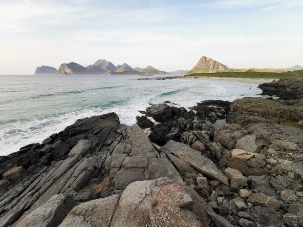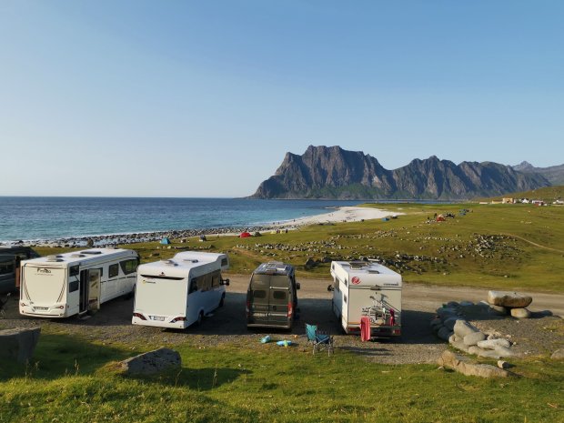 Zusammen mit den Coburgern wollten wir als nächstes den anscheinend sehr bekannten Haukland Strand anfahren. Der war aber leider am frühen Nachmittag schon sehr voll und hatte nicht einen einzigen Parkplatz frei für uns. Und deswegen war er auch total überlaufen. Also sind wir durch den kleinen Tunnel dahinter weiter bis zum Strand von Uttakleiv gefahren.