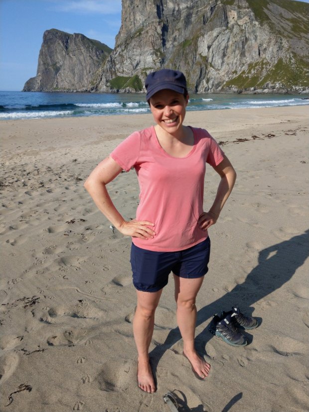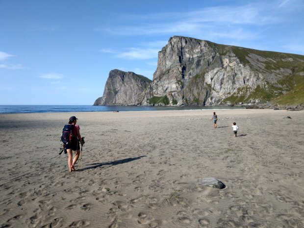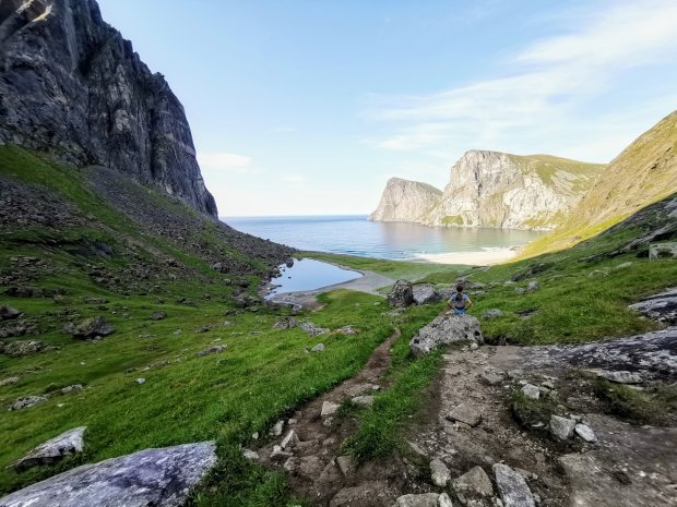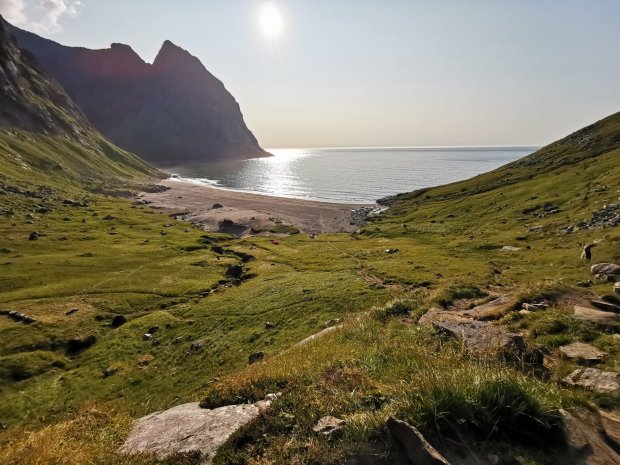 Wenn der Rückweg nicht so weit gewesen wäre, hätte ich nochmal einen Stein mitgenommen. Den bekannteren Kvalvika Strand haben wir dann aber links liegen lassen, auch wenn er komplett in der Sonne lag. Es waren schon einige Zelte da und uns kamen noch viele Leute mit reichlich Gepäck entgegen.