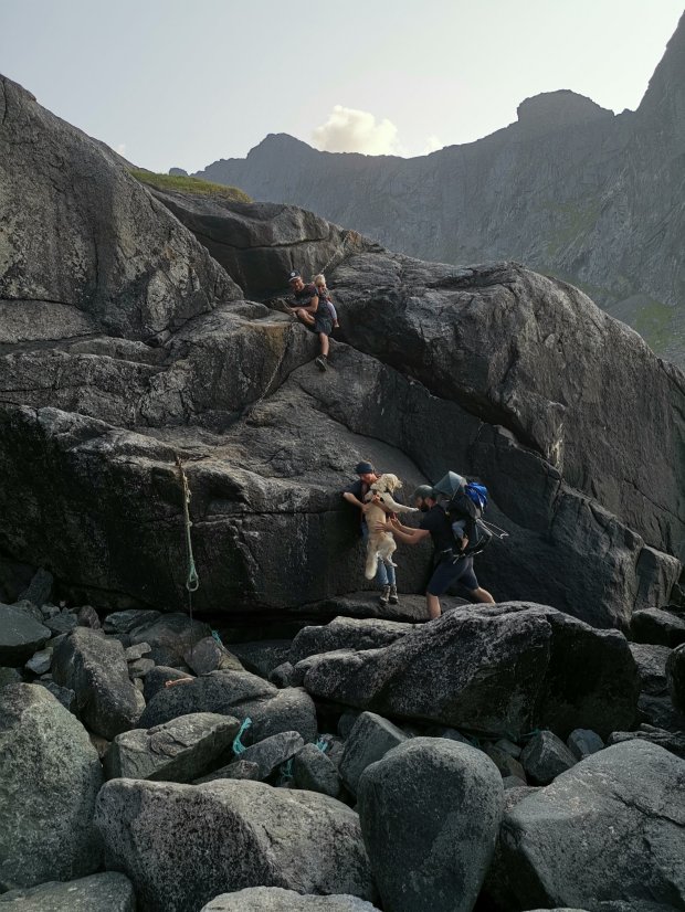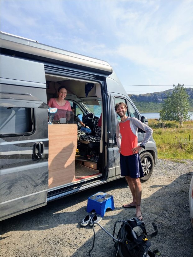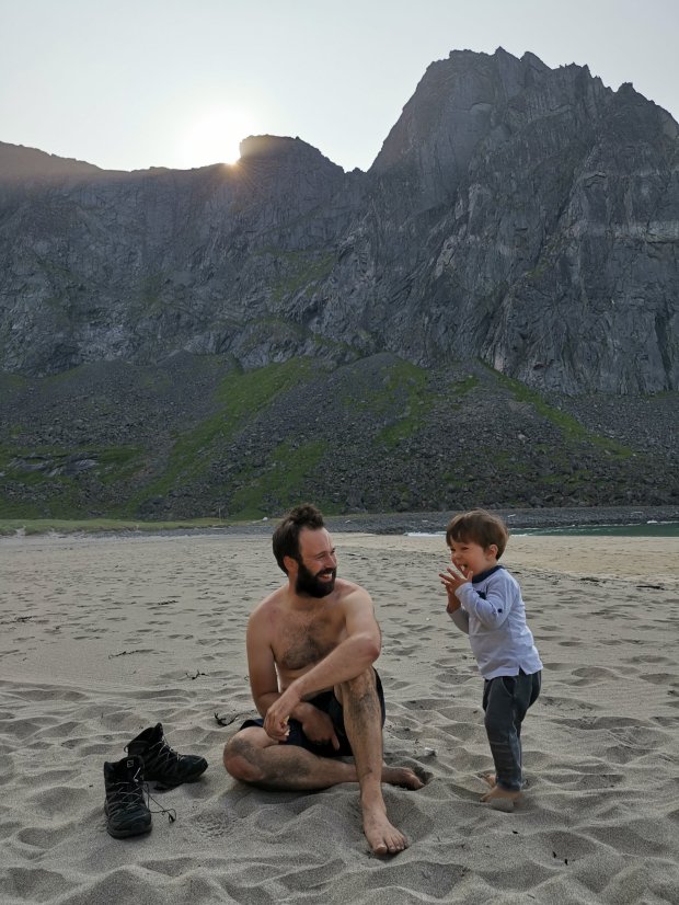 Zunächst fuhren wir zum berühmten Strand von Kvalvika, bzw. dem Ausgangspunkt zur Rundwanderung. Idealerweise stellt man ein Auto zum einen Trailhead und ein anderes zum Endpunkt, um sich knapp 4km Rückweg auf der Straße zu sparen. Das wollten wir eigentlich auch machen, aber an dem vorderen Parkplatz war alles voll und entlang der Straße war Halteverbot. Darauf hat uns ein netter Rosenheimer hingewiesen, gerade als wir uns in eine frei gewordene Lücke quetschen wollten. Von ihm bekamen wir dann auch den Tipp, dass es am alternativen Ausgangspunkt einen großen freien Platz zum Parken gibt und diese Wegroute eh die viel schönere ist. Perfekt. Als wir gerade noch unser Mittagessen kochen, erkennt Simon auf einmal Frederico wieder. Den Italiener, den wir gut 2,5 Wochen zuvor mal für 3 Stunden in Schweden mitgenommen haben. Der freut sich auch uns wieder zu sehen und erzählt, was er in der Zwischenzeit alles erlebt hat und was seine weiteren Pläne sind. Wie klein die Welt doch ist!