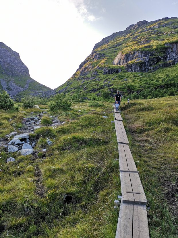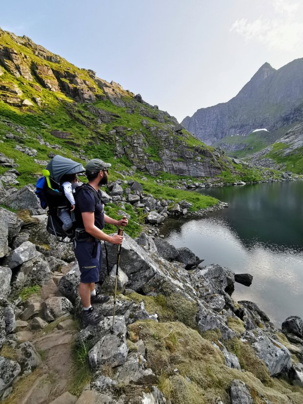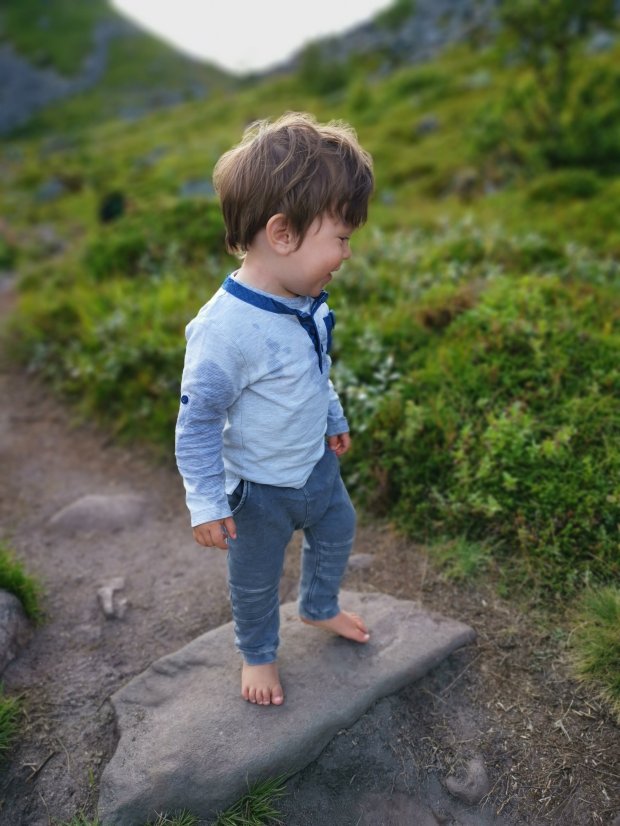 Und dann gehen wir auch schon los. Um kurz vor 15 Uhr. Zum Glück hatte Johannes noch nicht geschlafen und war dementsprechend kO in der Kraxe. Der Weg geht erst einmal gemütlich durch Moor Landschaft und an drei Trinkwasserseen vorbei. Zum Glück hat es lange nicht geregnet, sonst wäre das sicher eine Schlammschlacht geworden… Ich finde sogar ein paar leckere reife Moltebeeren, von denen ich jetzt weiß, dass sie golden sein müssen und nicht rot. 🙂