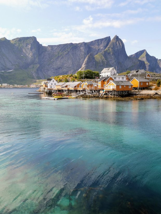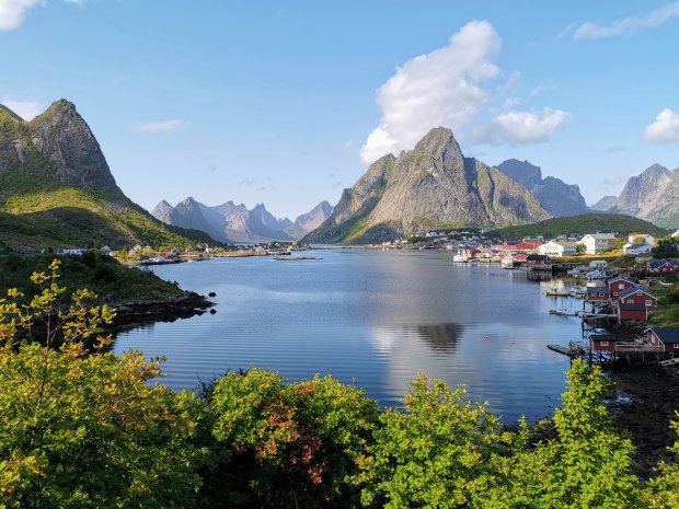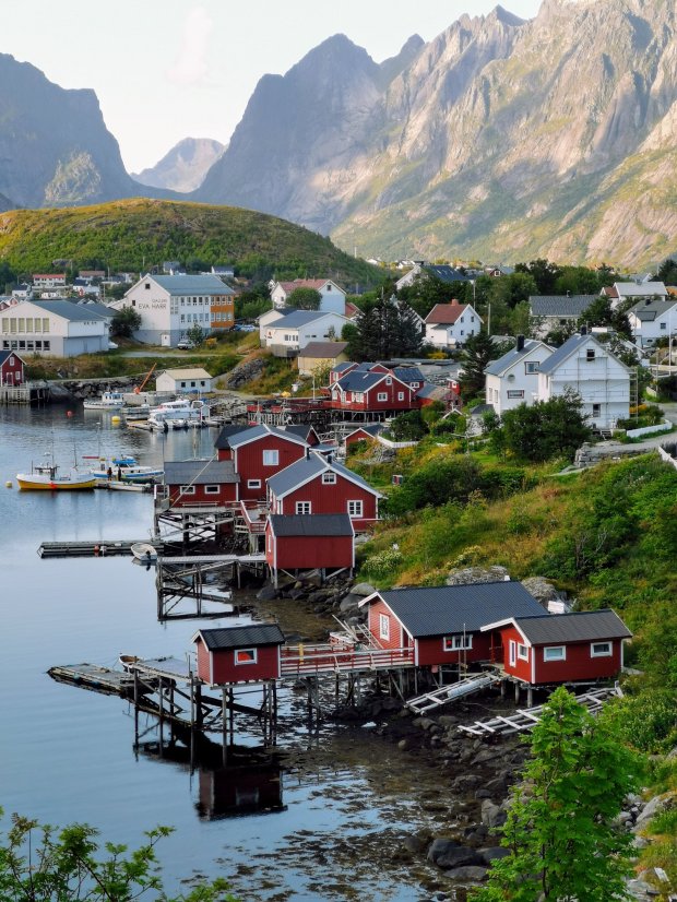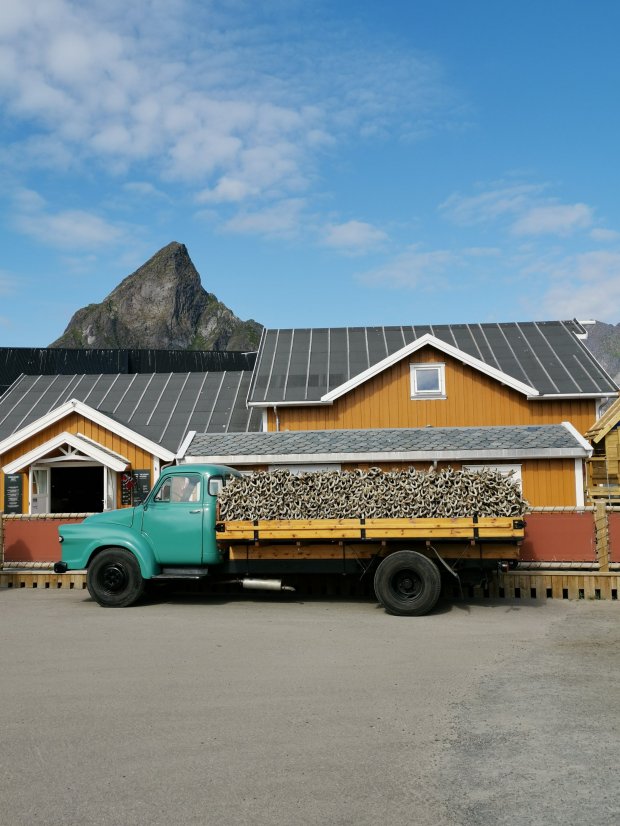 Wenn man bei Google Bilder von den Lofoten sucht, findet man häufig Fotos von dem kleinen Fischerort Reine, vor allem vom dortigen Hausberg aus fotografiert, dem Reinebringen. Und deswegen wollten wir da dann auch hin. Der Ausblick ziert schließlich das Titelbild des Rother Wanderführers. Je näher wir kamen, desto mehr Verkehr war auf den kleinen Straßen und viele Menschen standen herum und machten Fotos von den Fischerhütten.