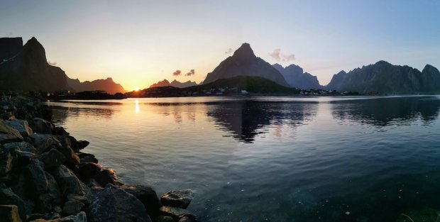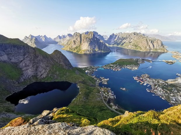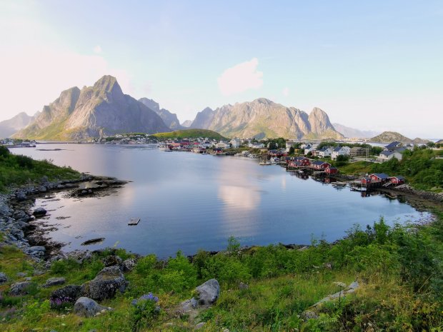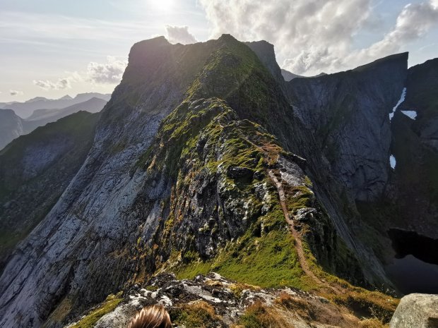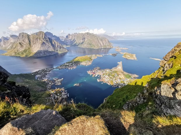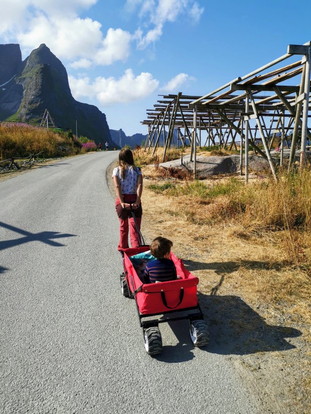 Nach dem Mittagessen ging es aber wieder. War wohl der Unterzucker. 🙂 Wenn man schon mal bei schönem Wetter auf den Lofoten ist, muss man auch auf den Berg rauf. Allerdings ist es wirklich kein Kindergipfel und ich gehe alleine mit Jonas rauf. Simon, Lisa und die Kinder bleiben unten und erkunden den örtlichen Spielplatz.