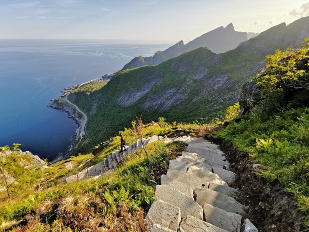 Der Wanderweg auf den Reinebringen wurde 2016 gesperrt, weil es wohl einige Unfälle gab. 2019 hat er im Sommer wieder eröffnet, nachdem in der Zwischenzeit nepalesische Sherpas eine Steintreppe hinaufgebaut haben. Kein Witz!