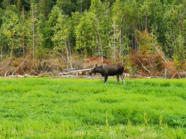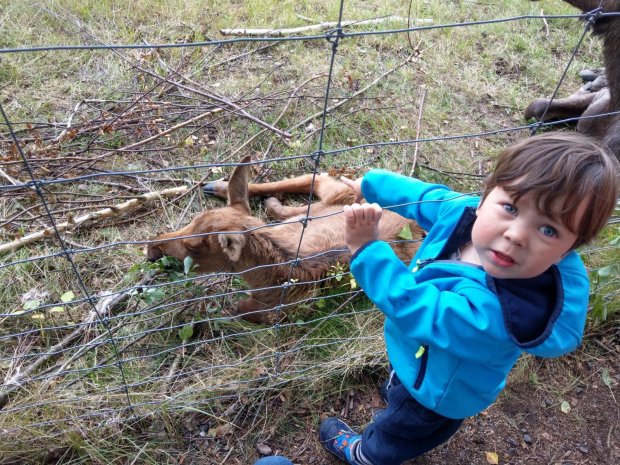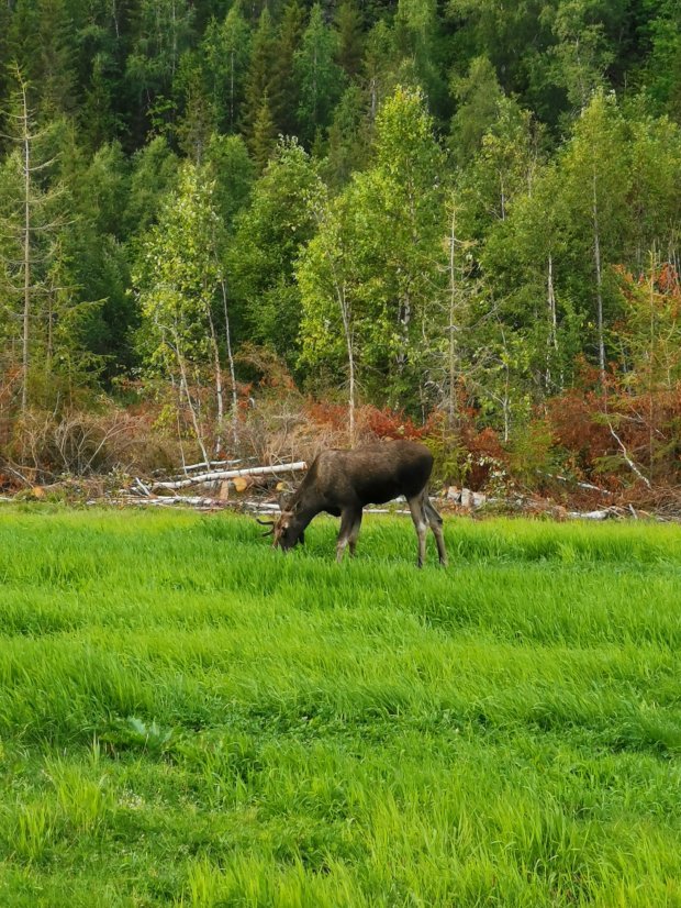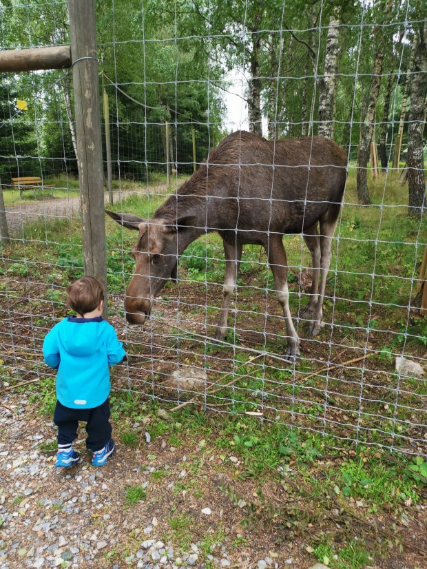 Beim nächsten Tankstop stehen wir an einem Rastplatz, an dem es einen kleinen Elchpark mit zahmen Elchen gibt. Auch wenn wir es nicht so wirklich gut finden, sind wir halt schon mal da und gehen rein. Es gibt schließlich auch vier Babys zu bestaunen.