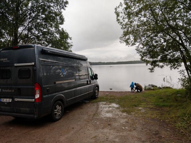 Die Abendplatzssuche gestaltet sich erst schwierig, weil das Wetter schlecht ist und der erste Platz am See mit Steilufer nicht ideal ist.
