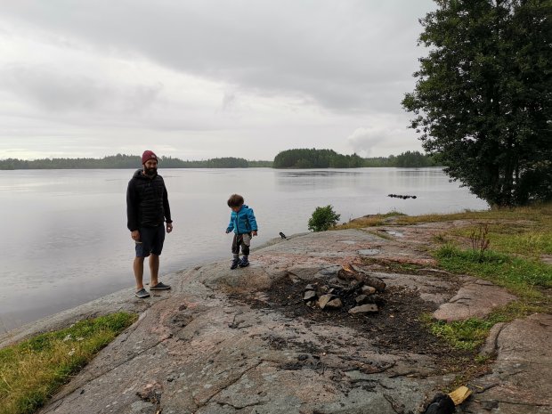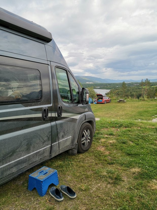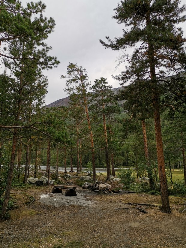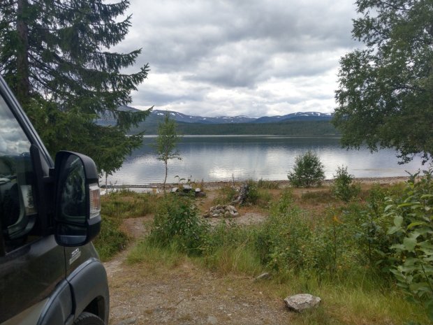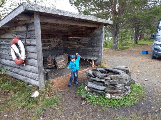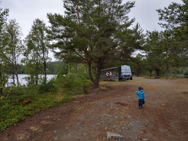 Wir übernachten an einem meeeega Platz auf einer Halbinsel, nicht weit nach der Grenze. Leider regnet es arg und wir können kein Lagerfeuer machen. Seit Uttakleiv auf den Lofoten fahren wir noch einen Sack Feuerholz durch die Gegend…