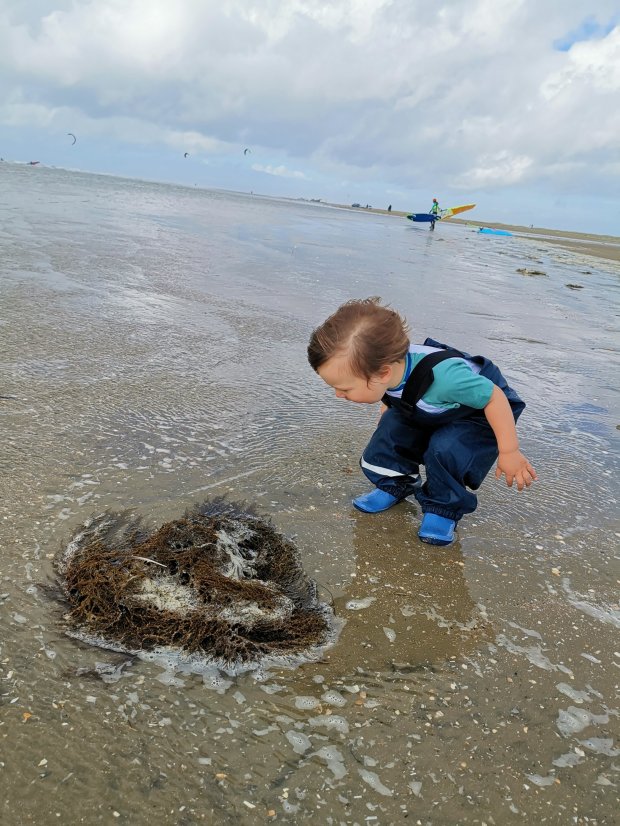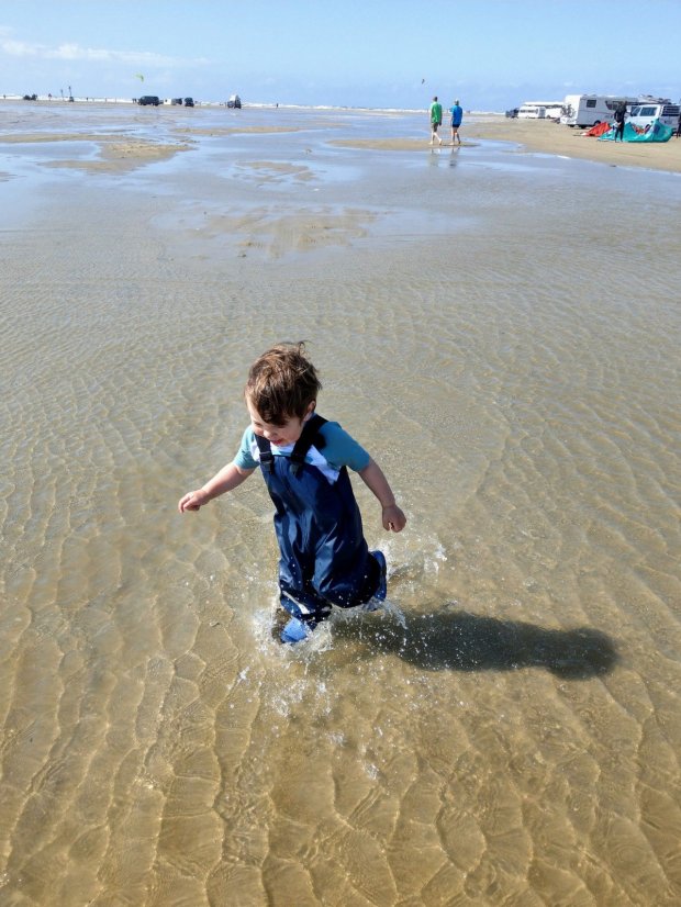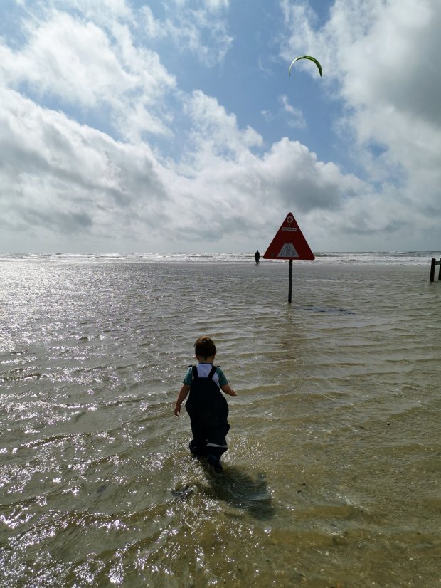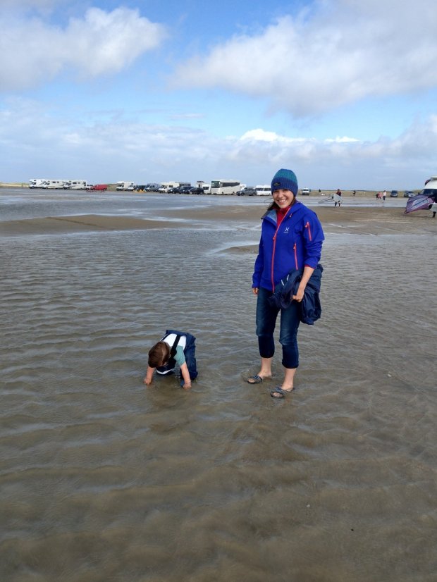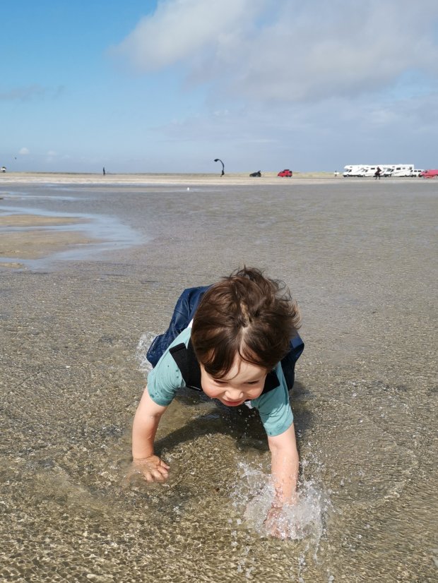Zwischenzeitlich fand Johannes es witzig, im seichten Wasser zu krabbeln, aber es war erstaunlich warm und insofern egal, dass er doch noch ganz nass wurde. Nur auf die steigende Flut mussten wir etwas achten und von der Sandbank aus schon durch knietiefes Wasser waten.