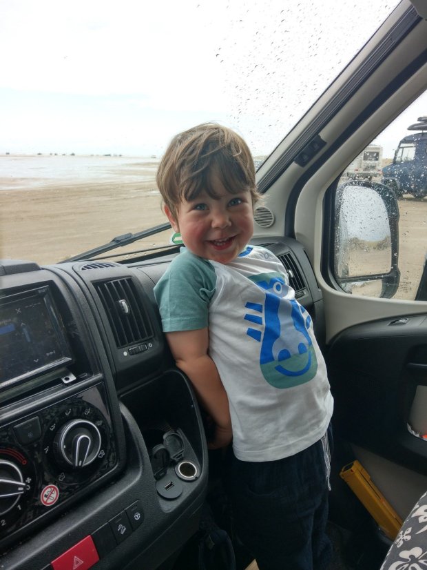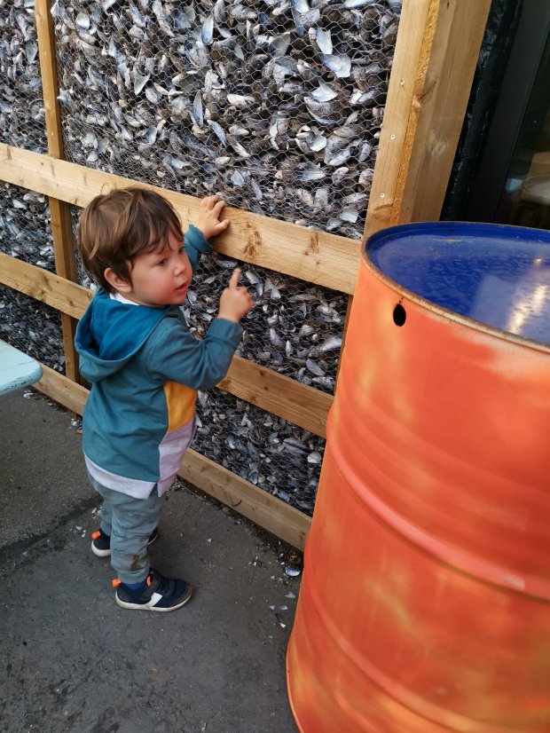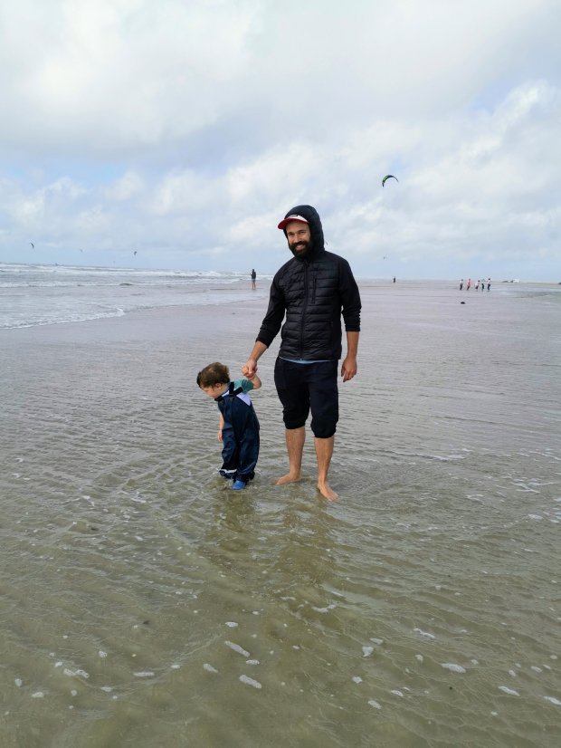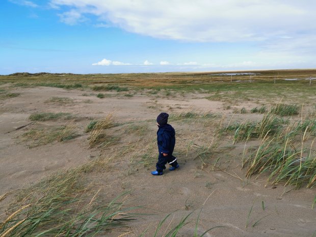 Als es aufhörte, trauten sich immer mehr Womos weiter nach vorne und auch wir parken um und machten uns fertig zum Spaziergang. Johannes habe ich in die Matschhose mit Gummistiefel gepackt, die sinnvollere Alternative wäre nur nackig gewesen. 🙂
