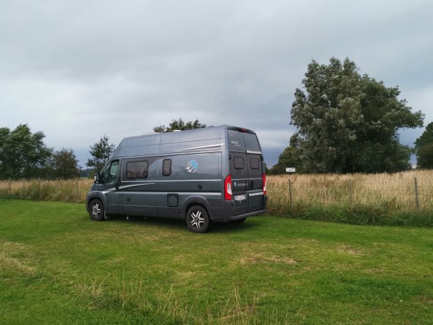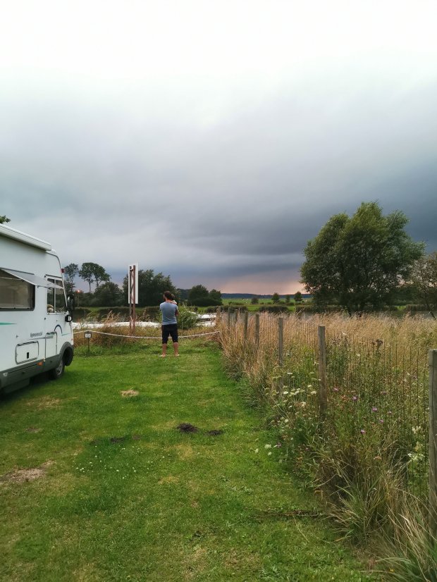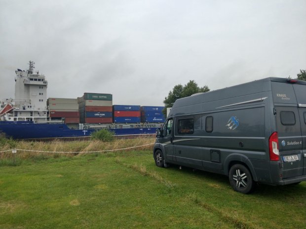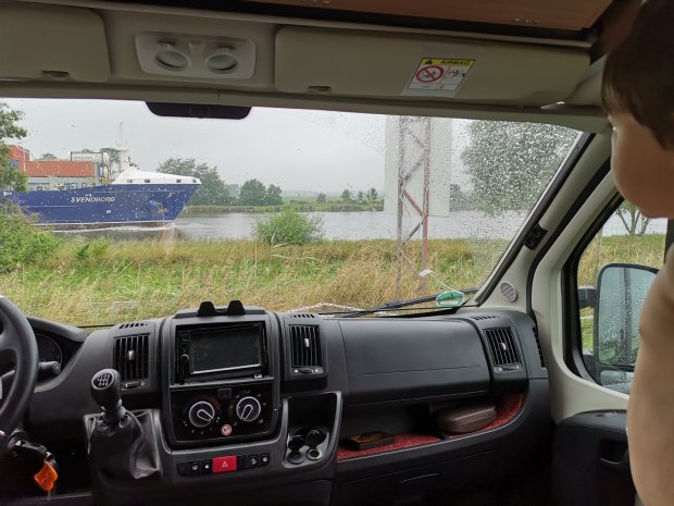 Unser Abendziel war dann schon ein Stellplatz in Deutschland, am Nordostseekanal bei Schachtholm. Vorher waren wir noch schnell einkaufen, während draußen ein ziemlich fieser Gewitterschauer niederging. Wir hatten ziemlich Angst vor Hagel, da der Riss in unserer Windschutzscheibe möglichst nicht mehr wachsen sollte. Aber es ging alles gut.