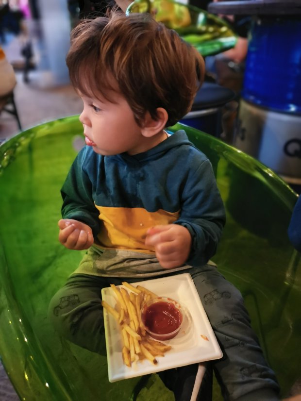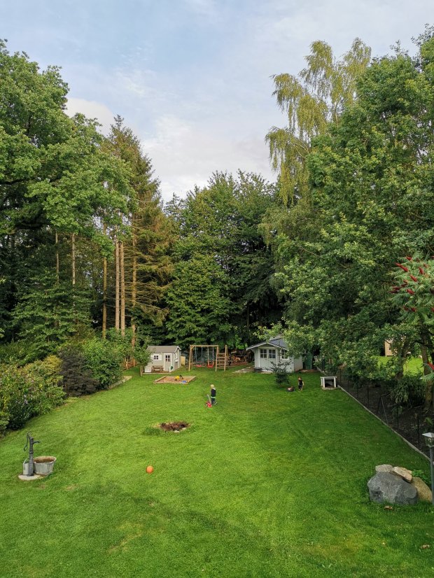 Die Kinder konnten ein bisschen draußen herumlaufen. So eine Location hätte ich auch gerne in der näheren Umgebung. Bei uns wurden es übrigens sehr leckere Burger. Johannes freute sich über die Pommes dazu.