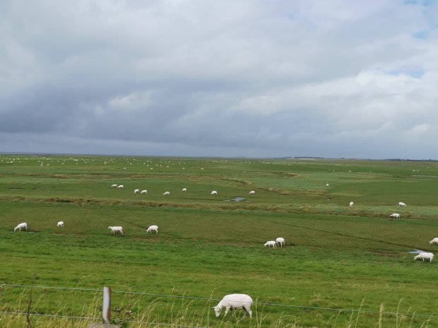 Er war dann schon total müde und wir haben ihn gleich in seinen Schlafanzug gesteckt, noch bevor wir zum Parkplatz am Freibad fuhren und dort die Nacht verbrachten. Nicht ideal, weil daneben die Bahnstrecke verläuft, aber manchmal ist es halt so. In der Nacht hat es dann auch noch angefangen zu regnen und wir ließen es total gemütlich angehen. Erst kurz vor Mittag brachen wir auf in Richtung der Insel Romo, wo das Wetter am Nachmittag besser werden sollte. Die Anfahrt ging entlang eines langen Damms und vorbei an ganz vielen Schafen.
