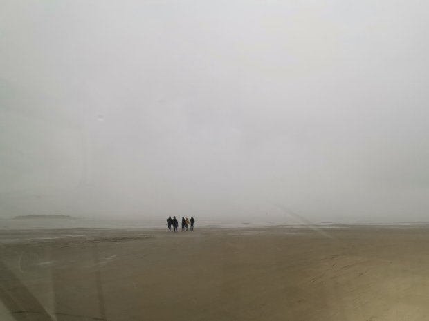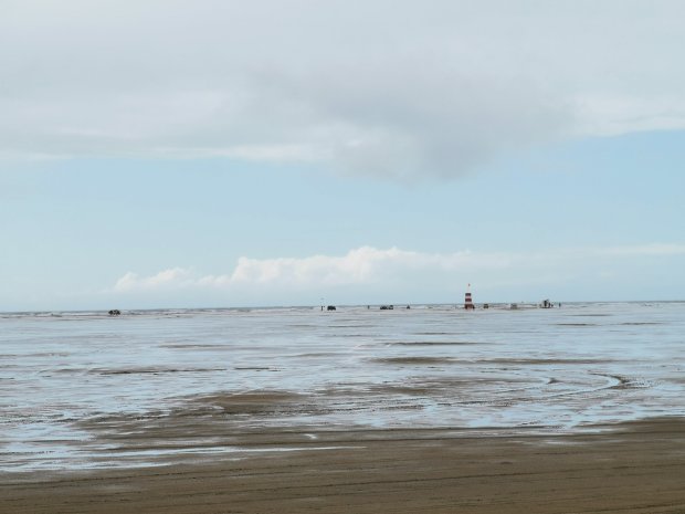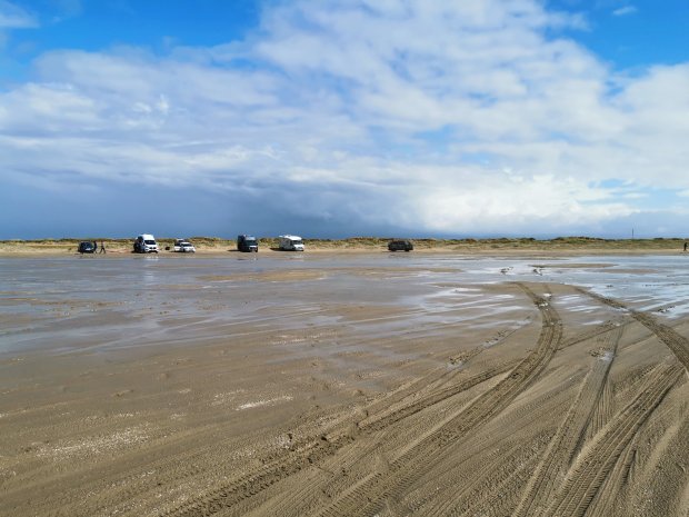 Der Strand von Romo ist bekannt, weil man mit dem Auto bzw. Womo bis ganz nach vorne fahren kann, weil der Strand so breit ist. Als wir ankamen, regnete es aber gerade wie aus Eimern und es war mächtig windig, so dass wir uns erst einmal ganz hinten gleich hinstellen und abwarteten.