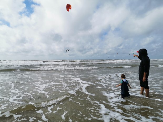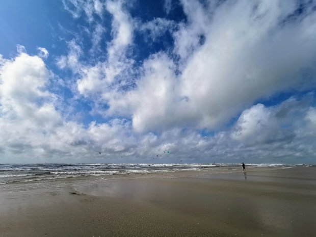 Überall stand noch das Regenwasser und ich hätte lieber auch eine kurze Hose anziehen sollen… Egal. Was für ein cooler Strand!!! Wir marschierten vor bis ans Meer, um den Kitern und Windsurfern zuzusehen.