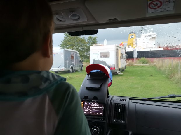 Zwischen der ersten Reihe und dem Kanal befindet sich auch noch eine kleine Straße.Während Simon für uns kochte, spielten Johannes und ich Fangen ums Womo herum, da es zu regnen aufgehört hatte. Immer wieder fuhren große und kleine Schiffe vorbei, ziemlich cool!