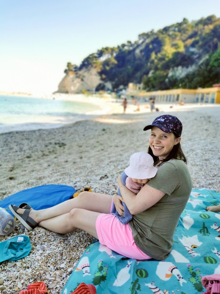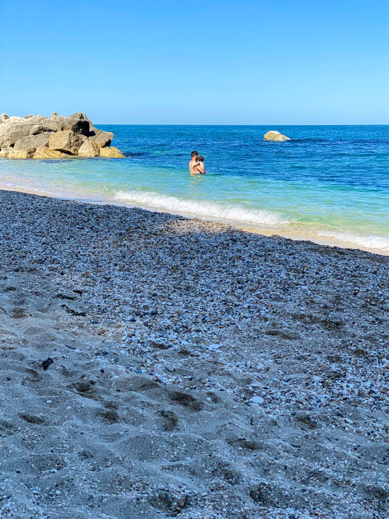 Ein Kieselstrand mit kleinen Steinchen ist ideal, da die nicht überall kleben bleiben. 🙂 Im Ort oben waren wir auch, allerdings muss man sehr steil die Straße hoch und an dem Tag war es leider sehr windig. Für ein Eis und ein paar Lebensmitteleinkäufe hat’s aber gepasst. Die anderen Geschäfte hatten fast alle zu. Immer diese komischen italienischen Öffnungszeiten…