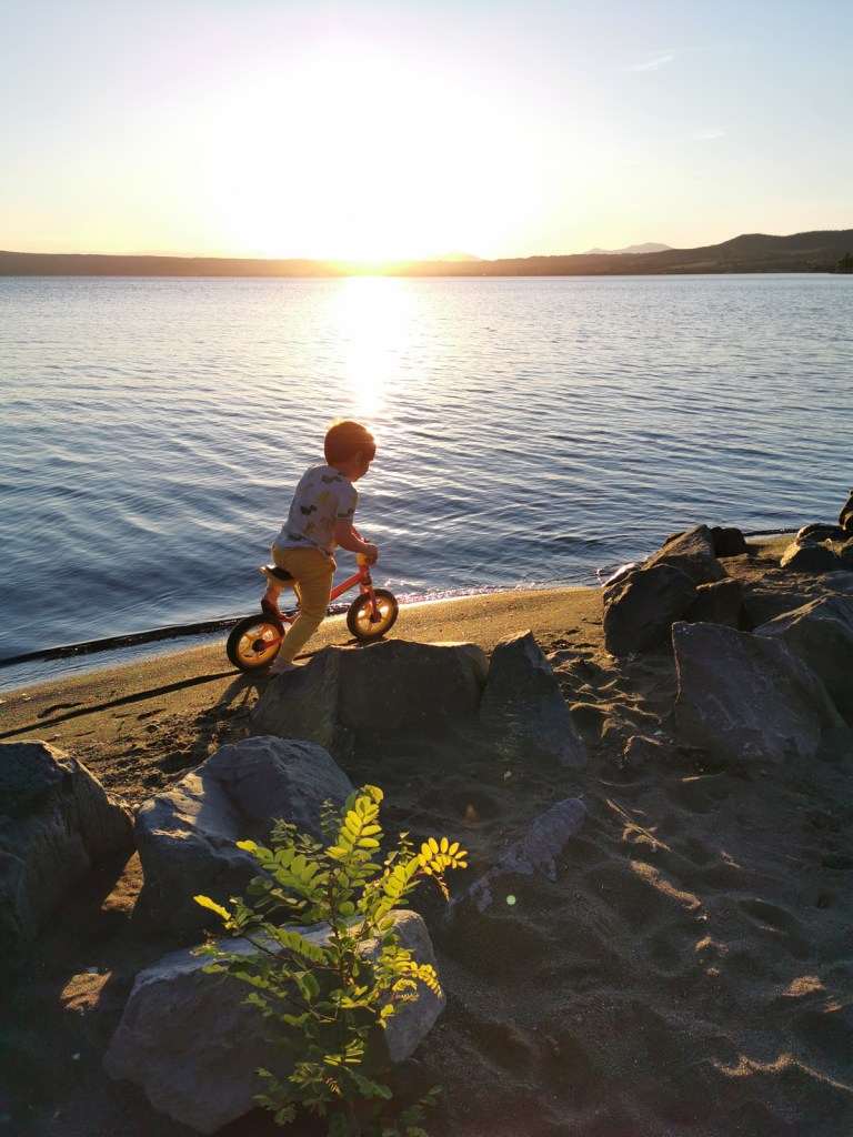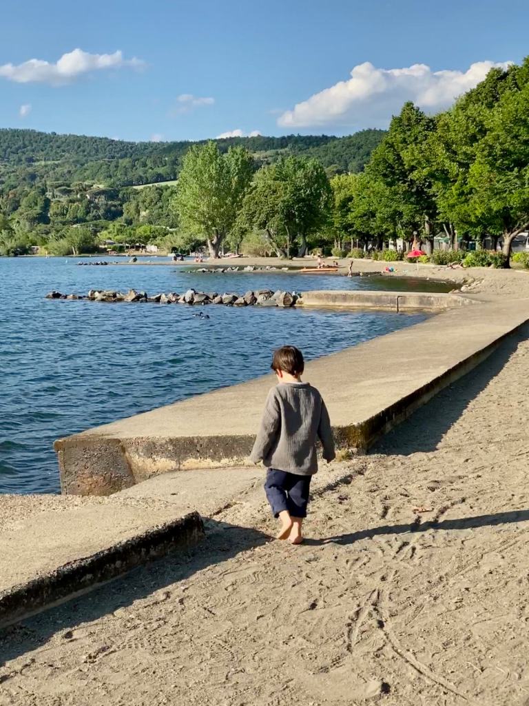 Der See ist herrlich flach, hat einen Sandstrand und das Wasser ist für Johannes schon recht angenehm zum planschen und pritscheln. Man kann am See entlang zu Fuß in den Ort vorwageln, echt super.
