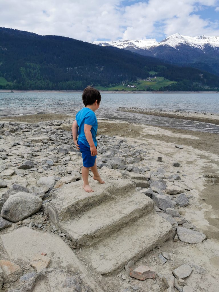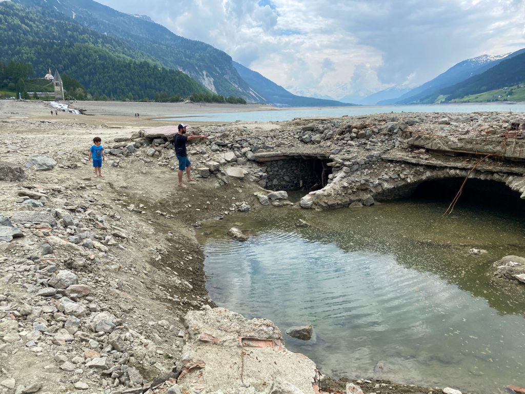 Da wir Hitze ja nicht so mögen, fahren wir weiter mit der ein oder anderen Pause und schaffen es zum Schlafen bis zu den Montiggler Seen südlich von Bozen, an denen wir schon einmal auf dem Weg nach Livorno übernachtet haben. Am nächsten Morgen holen wir Semmeln und Brot und fahren weiter. Gegen Mittag erreichen wir den Reschenpass und machen eine längere Pause mit Spaziergang. Der See hat derzeit sehr wenig Wasser und Simon will die Überreste des ehemaligen Dorfes erkunden. Gut, dass Johannes schon groß und schlau genug ist und Gefahren ein bisschen einschätzen kann. Trotzdem grenzwertig, dass das nicht alles abgesperrt ist oder es wenigstens Hinweise auf die Gefahr von Kellerlöchern usw. gibt, in die man hineinfallen könnte.