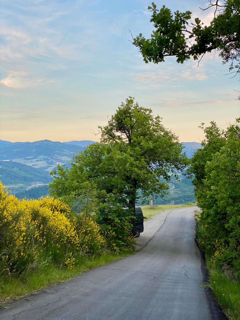 Wirklich schön, aber halt leider echt sehr weit zum Fahren. Am zweiten Juni brechen wir also wieder auf und fahren bis irgendwo in die Berge unterhalb von Bologna, wo es ein bisschen dauert bis wir uns auf einen Übernachtungsplatz einigen. Dafür ist der dann aber wirklich wunderschön mit einer wahnsinns Aussicht.