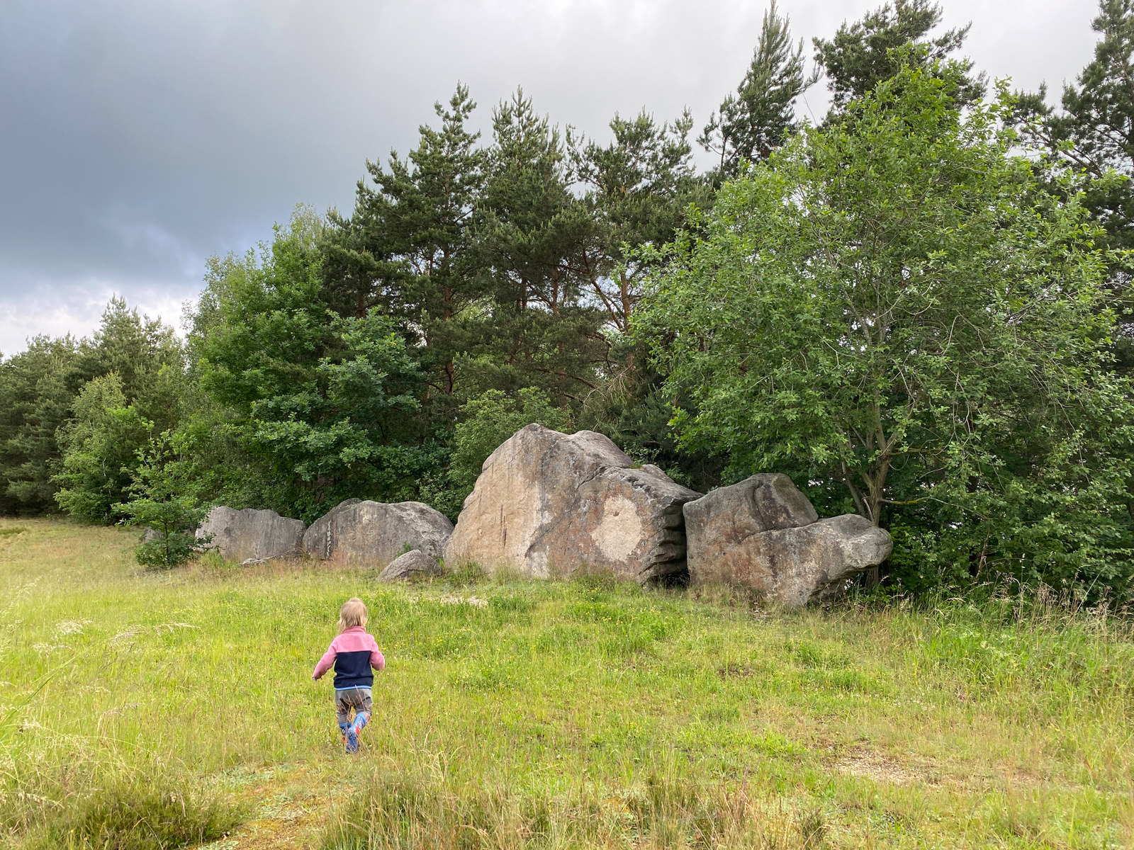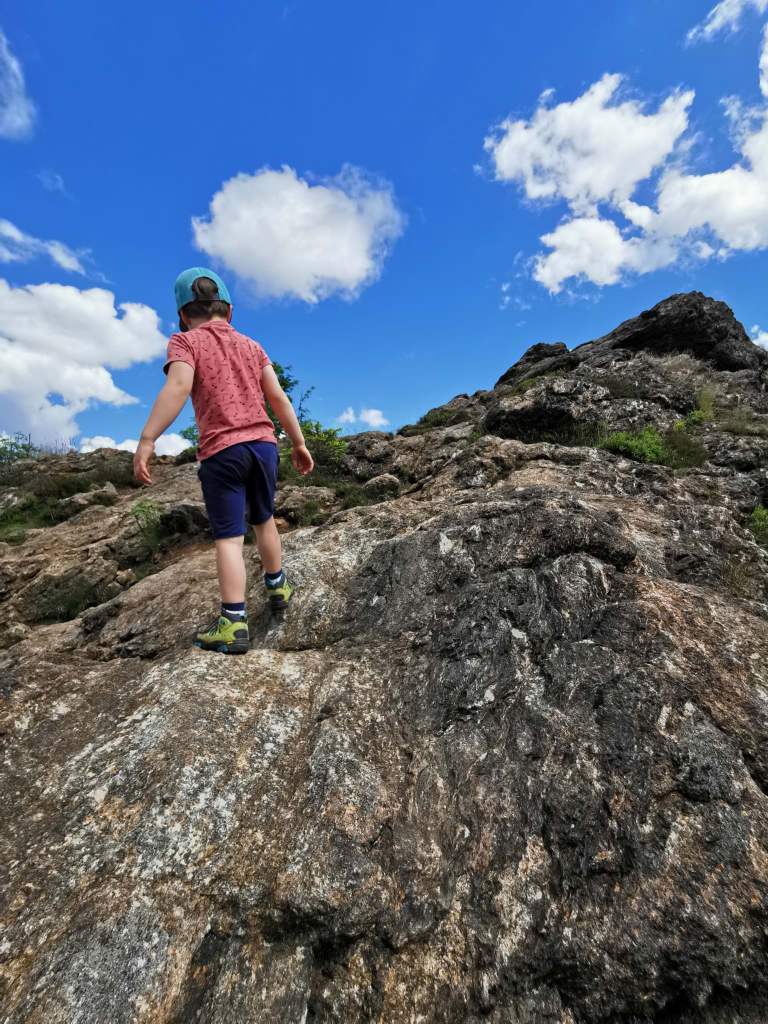 Am Morgen sieht das ganze dann gleich viel besser aus und der Platz erweist sich als absoluter Glücksfall in vielerlei Hinsicht: ein kleiner Spielplatz, Kletterfelsen, gute Aussicht und eine Wiese voller spannender Krabbeltiere für die Becherlupe. Wir haben es nicht ganz eilig loszukommen.
