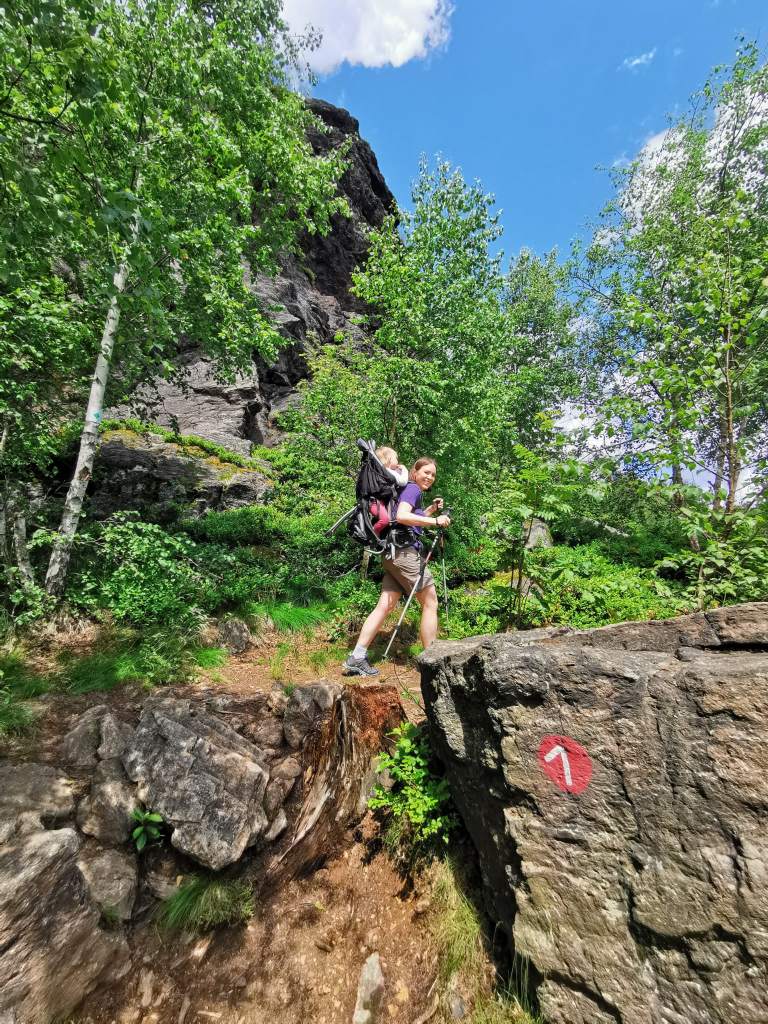 Die Nacht in der Einfahrt war gut. Das Wetter ist besser als angesagt und wir brechen nach dem Heckenschneiden und Mittagessen auf nach Bodenmais, um eine kleine Wanderung am und um den Silberberg zu machen. Nachdem Simon „Rücken hat“, trage ich heute Elena in der Kraxe. Auf dem steinigen und steilen aber schönen Weg ist kaum was los, die meisten Leute fahren mit dem Sessellift rauf und anschließend mit der Rodelbahn wieder hinunter.