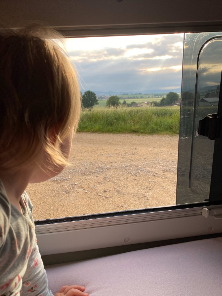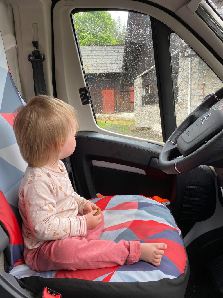 Hat aber leider nur halb geklappt. Elena will partout nicht einschlafen, ist aber irgendwann sauber grantig. Das größere Problem ist aber, dass wir irgendwann MIT dem lila Gewitterstreifen fuhren (schlimmste Kategorie), der bei RegenRadar angezeigt war und es so übel regnet, dass man auch mit den feinen Grabber Reifen nicht mehr gerne weiter fahren will. Also Plan für den Nachtplatz verworfen und via Google Maps einen in unmittelbarer Nähe gesucht und gefunden. Puh, das war knapp. Elena schläft dann aber hinten dank oder trotz des prasselnden Regens und grollenden Donners schnell ein und wir dann auch bald darauf und verbringen eine gute 1. Nacht.
