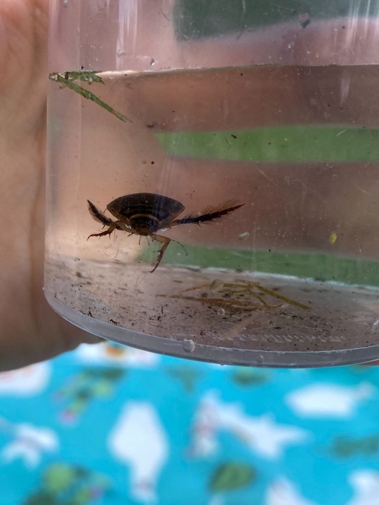 Danach beschließen wir, doch erst mal weiter zu fahren, aber nur zwei Kilometer an einen Naturbadesee. Dort wird auch geplanscht und zig Schnecken gesammelt und ein Taumelkäfer (wir dachten erst Gelbrandkäfer) in der Becherlupe genau begutachtet.