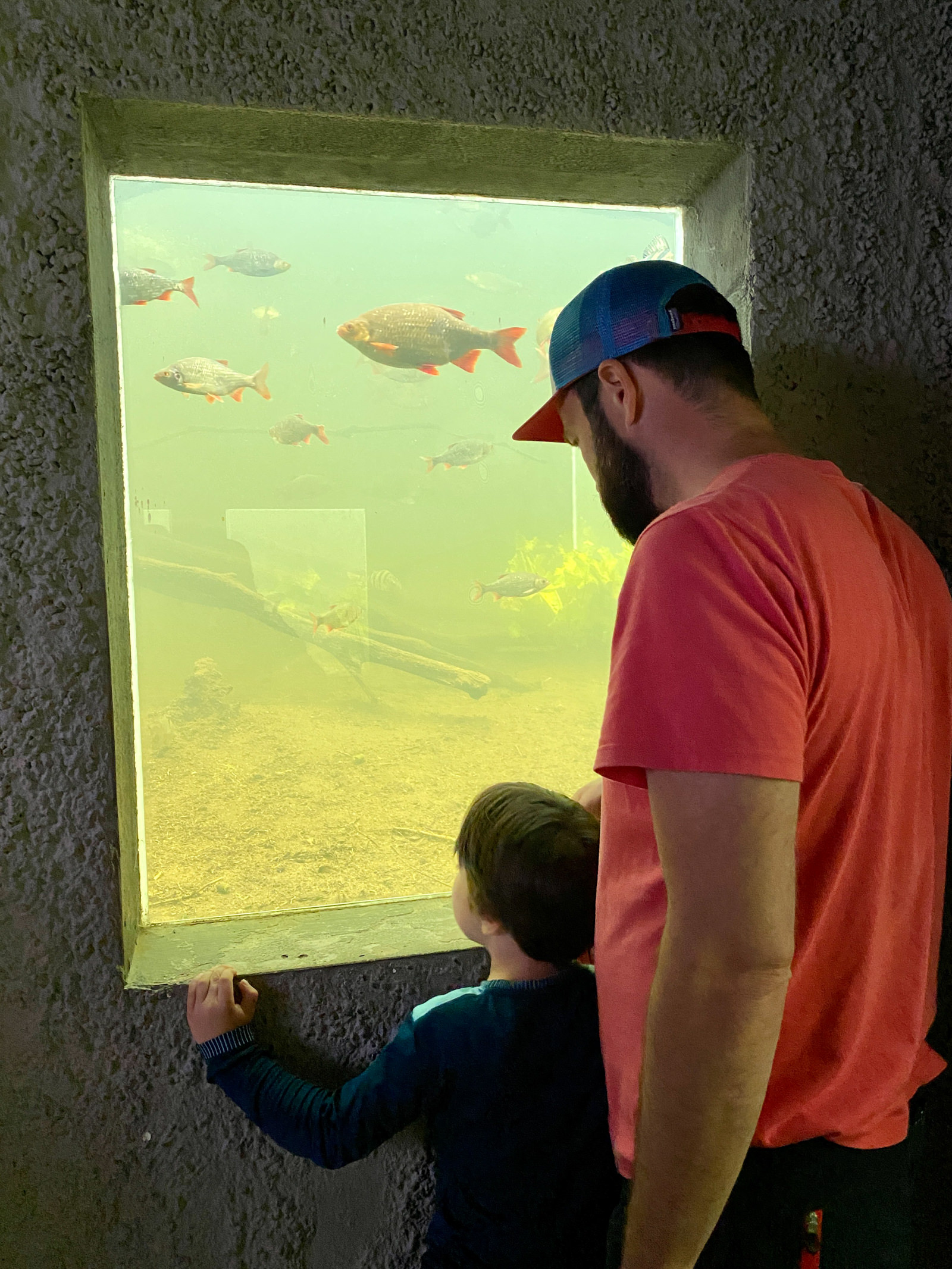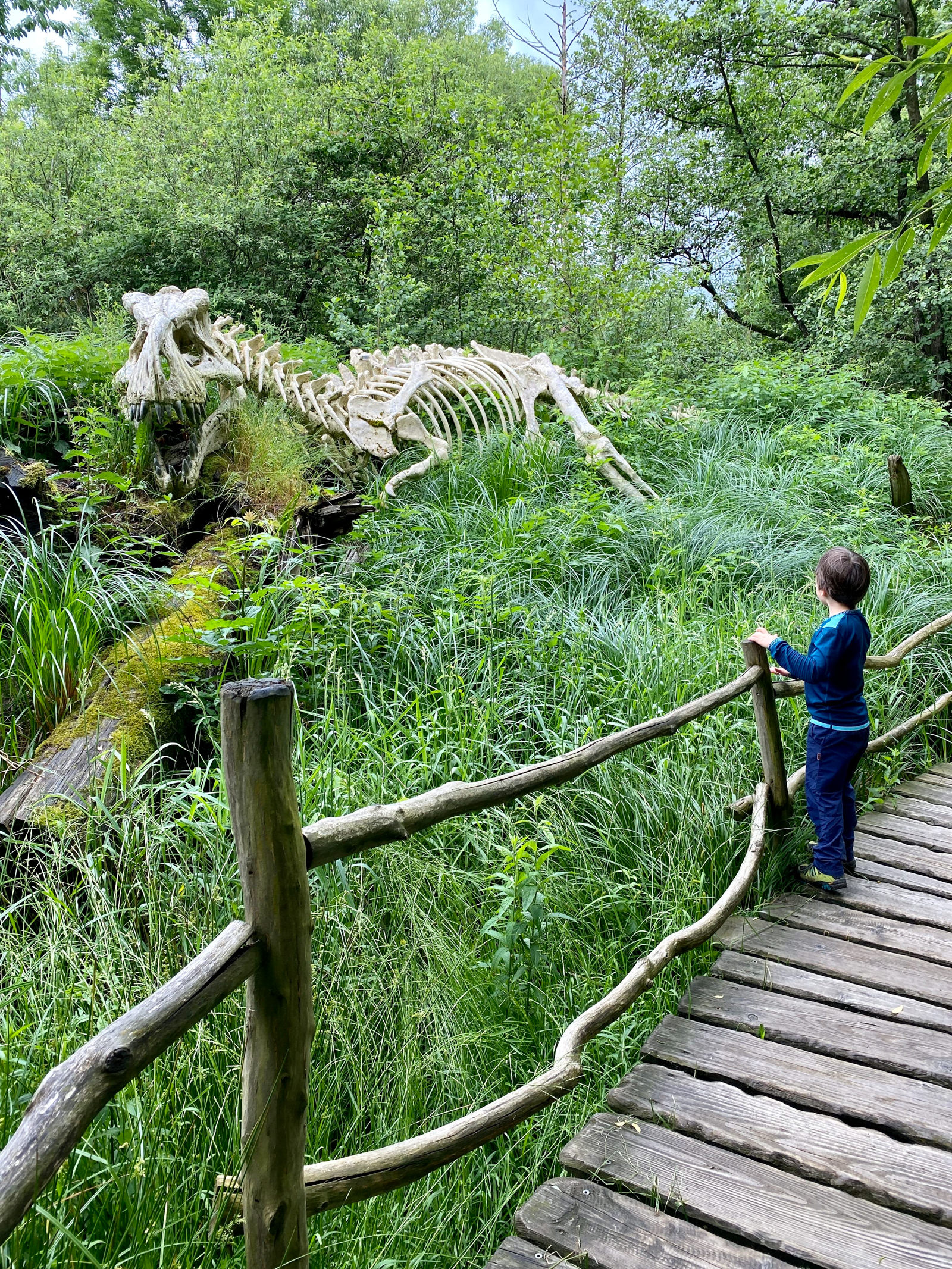 Der Tag startet nass und mit anhaltendem Regen. Zum Glück schlafen wir immerhin bis fast 8. Dann erst einmal in Ruhe frühstücken und überlegen was der Tag bringen soll. Da sich eine längere Regenpause ankündigt, beschließen wir, nochmal nach Furth zu fahren und in den Wildgarten zu gehen. Da ist zum Glück kaum was los und wir erfreuen uns an dem üppigen Grün überall und den vielen Entdeckungsmöglichkeiten, wie der Unterwasserbeobachtungsstation, einem Irrgarten, einem (nachgebauten) T-Rex Skelett und dem größten Baumhaus überhaupt.