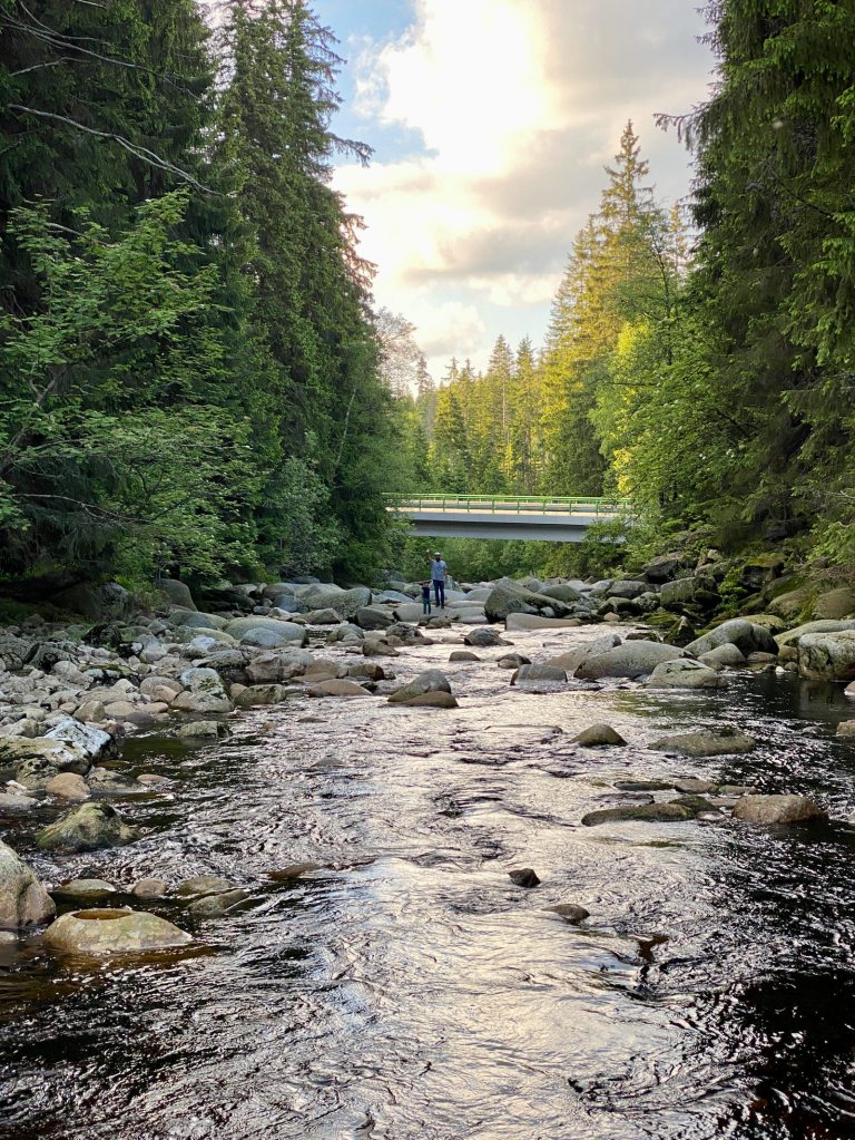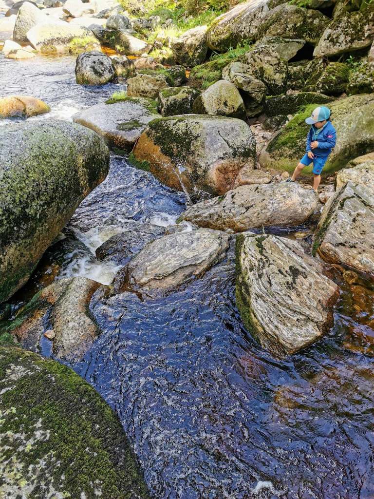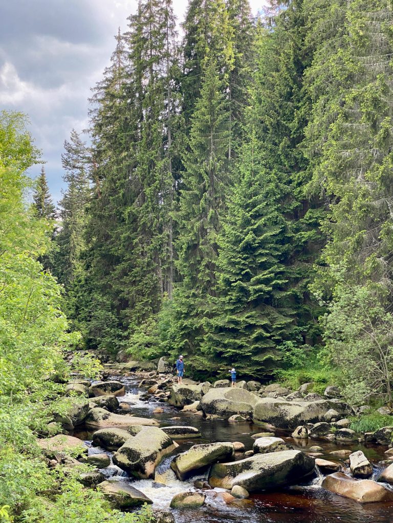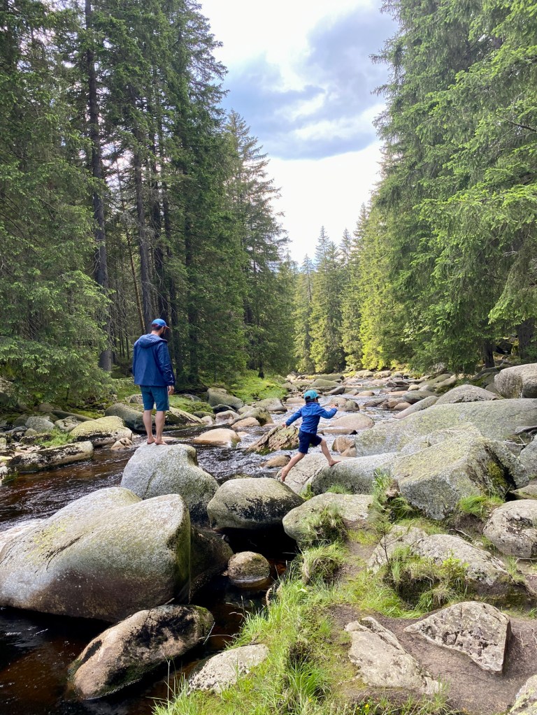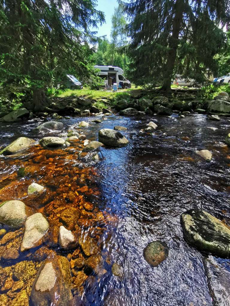 Es gibt keinen Spielplatz, aber den brauchen wir auch nicht. Hier gibt es wahnsinnig viele verschiedene Insekten, die in der Becherlupe gesammelt werden. Außerdem kann man auf den Steinen im Fluss super rumklettern oder Steine ins Wasser werfen. Das Wetter wird immer besser und weil Freitag ist, wird der Platz auch immer voller. Außer uns ist nur ein anderes deutsches Womo da und eine nette Niederländerin im Zelt, ansonsten alles Tschechen. Der Platz ist beliebt. Verstehen wir.