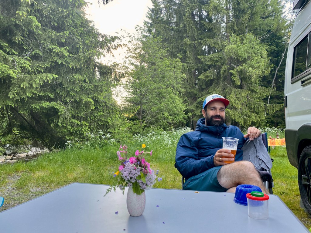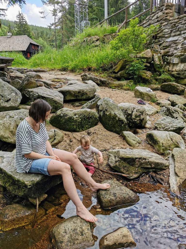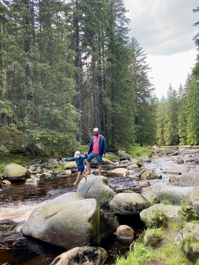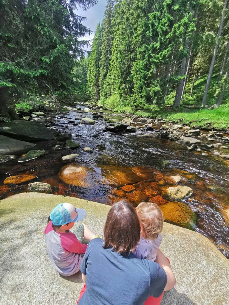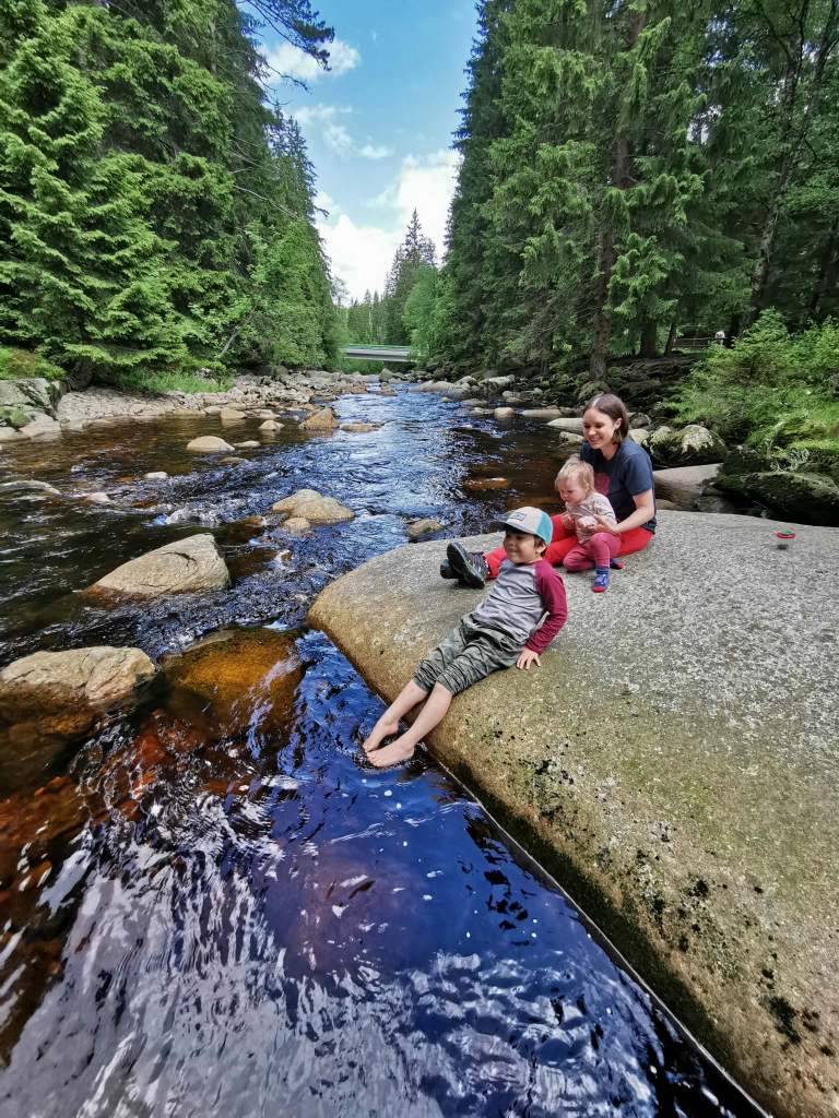 Es gibt keinen Spielplatz, aber den brauchen wir auch nicht. Hier gibt es wahnsinnig viele verschiedene Insekten, die in der Becherlupe gesammelt werden. Außerdem kann man auf den Steinen im Fluss super rumklettern oder Steine ins Wasser werfen. Das Wetter wird immer besser und weil Freitag ist, wird der Platz auch immer voller. Außer uns ist nur ein anderes deutsches Womo da und eine nette Niederländerin im Zelt, ansonsten alles Tschechen. Der Platz ist beliebt. Verstehen wir.